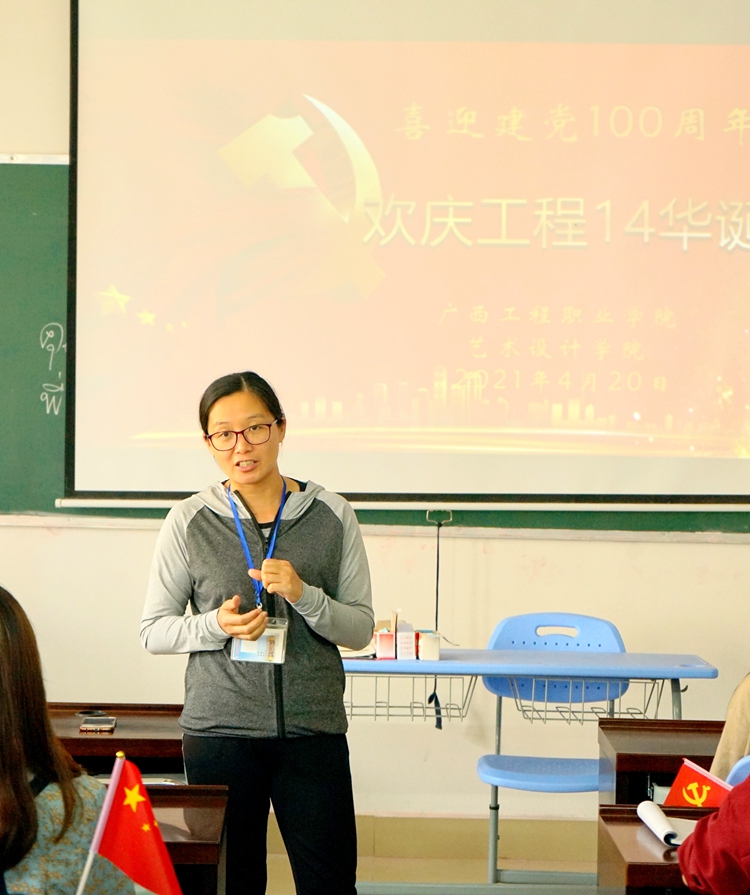 2021年4月20日下午,廣西工程職業(yè)學(xué)院藝術(shù)設(shè)計(jì)學(xué)院在設(shè)計(jì)樓402多媒體教室開展“喜迎建黨100周年,歡慶工程14華誕”主題活動,本次活動邀請了藝術(shù)設(shè)計(jì)學(xué)院黨支部書記兼副院長覃鳳姣、分團(tuán)委書記兼學(xué)生科科長潘翠萍、全體輔導(dǎo)員、專任教師以及學(xué)生代表參加了活動,活動由藝術(shù)設(shè)計(jì)學(xué)院學(xué)生會鄭智元同學(xué)主持。