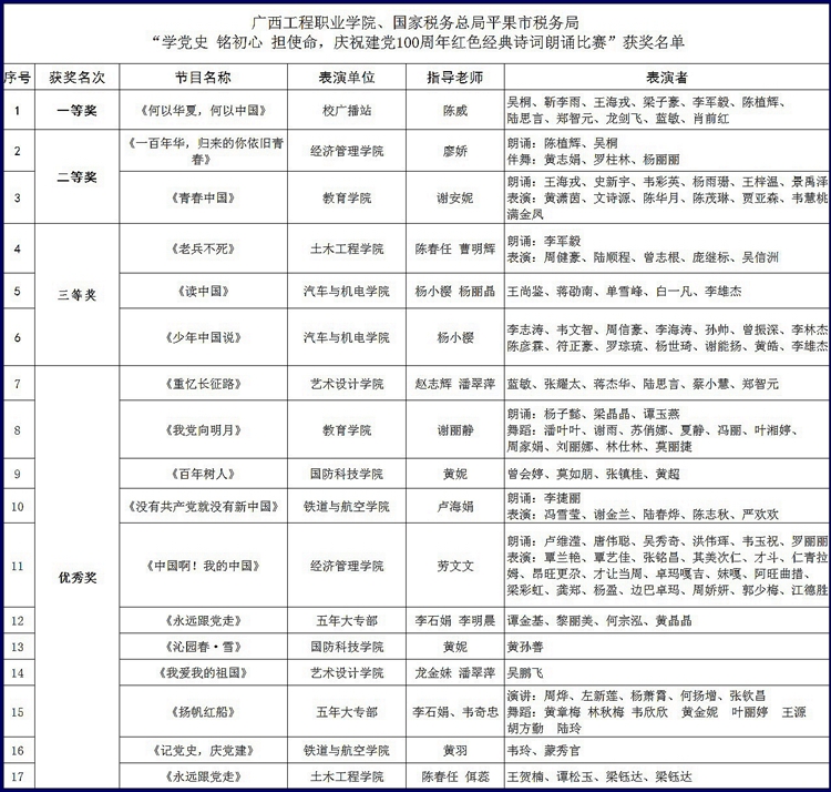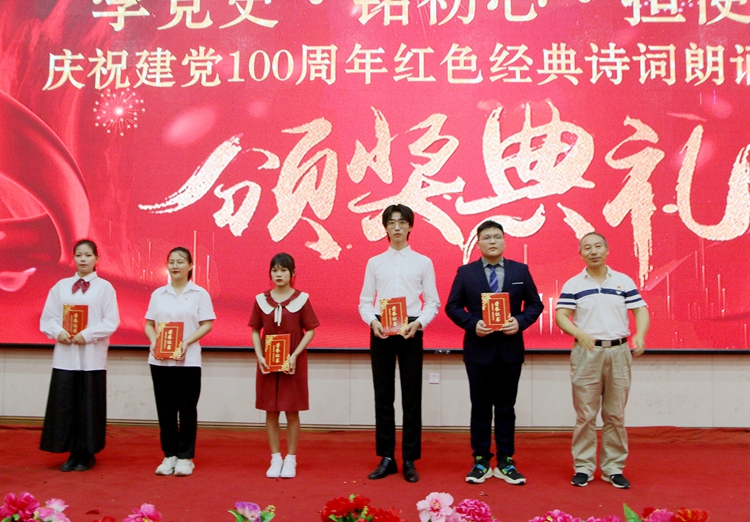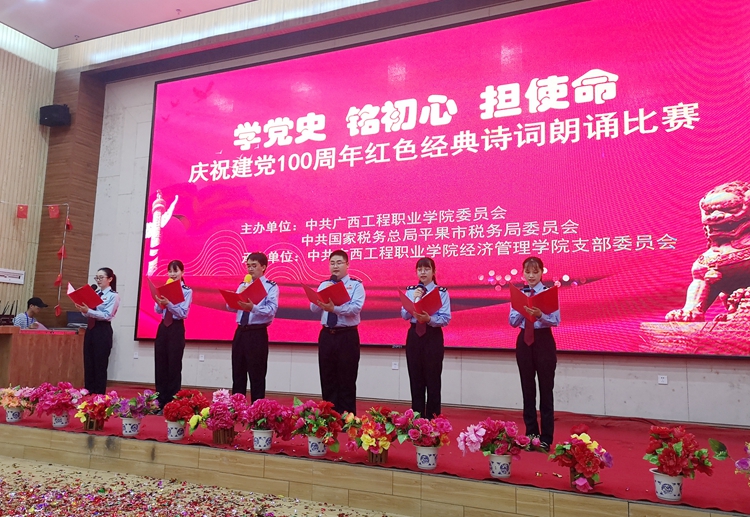 為慶祝中國(guó)共產(chǎn)黨成立100周年,傳承紅色基因,賡續(xù)共產(chǎn)黨人精神血脈,進(jìn)一步激發(fā)大學(xué)生的愛黨愛國(guó)愛社會(huì)主義情懷。6月29日晚,由中共廣西工程職業(yè)學(xué)院委員會(huì)、中共國(guó)家稅務(wù)總局平果市稅務(wù)局委員會(huì)聯(lián)合主辦,中共廣西工程職業(yè)學(xué)院經(jīng)濟(jì)管理學(xué)院支部委員會(huì)承辦的“學(xué)黨史、銘初心、擔(dān)使命,慶祝建黨100周年紅色經(jīng)典詩(shī)詞朗誦比賽”在學(xué)校圖文信息大樓報(bào)告廳舉行。