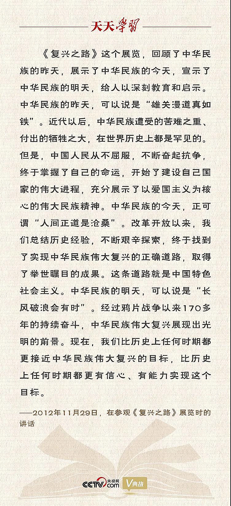 黨的十八大勝利閉幕后不久,2012年11月29日上午,習(xí)近平總書記率新一屆中央領(lǐng)導(dǎo)集體參觀國家博物館《復(fù)興之路》展覽并發(fā)表重要講話,深刻總結(jié)了中華民族波瀾壯闊的奮斗歷程,并用“雄關(guān)漫道真如鐵”“人間正道是滄桑”“長風(fēng)破浪會有時”這三句詩詞,概括了中華民族的昨天、今天和明天,闡述了“中國夢”的深刻內(nèi)涵,表達(dá)了走中國特色社會主義道路的堅(jiān)強(qiáng)決心和實(shí)現(xiàn)中華民族偉大復(fù)興的堅(jiān)定信心。