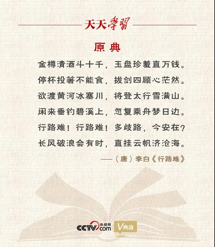 李白的《行路難》共三首,“長風(fēng)破浪會有時”出自第一首。唐天寶元年(742年),李白奉詔入京,擔(dān)任翰林供奉。后因權(quán)臣讒毀排擠,被“賜金放還”?!缎新冯y》便是李白離開長安時所作。結(jié)尾兩句“長風(fēng)破浪會有時,直掛云帆濟(jì)滄海”,詩人相信盡管前路障礙重重,但終將有一天會像南朝宗愨一樣,“乘長風(fēng)破萬里浪”,掛上云帆,橫渡滄海,到達(dá)理想的彼岸。