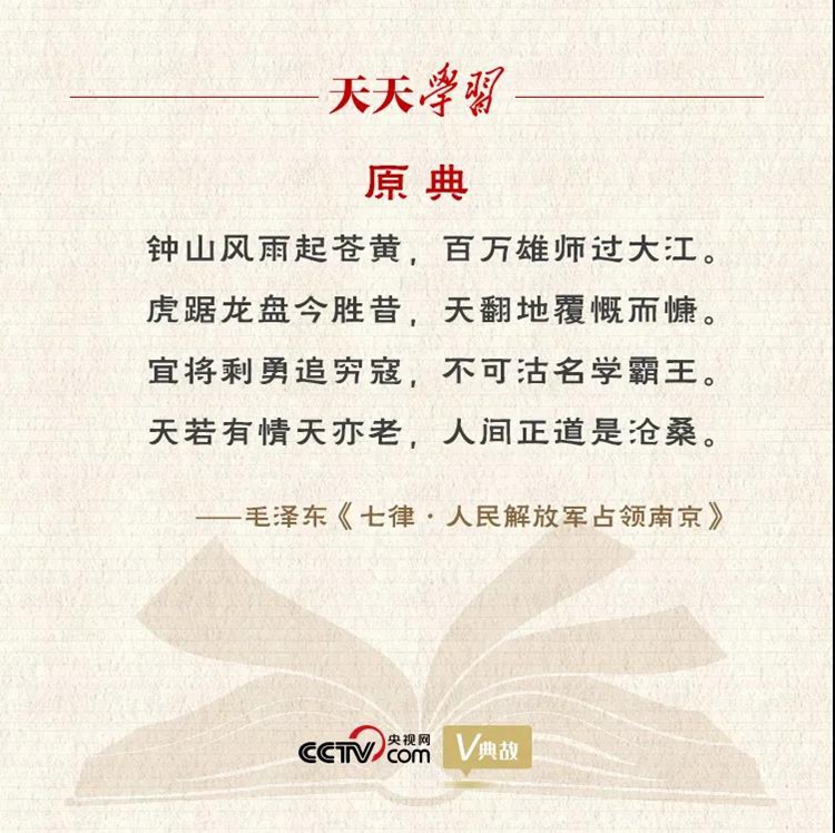 1949年4月21日,人民解放軍百萬大軍橫渡長江,4月23日一舉攻克國民黨盤踞22年的統(tǒng)治中心南京。毛澤東在北平西郊香山的雙清別墅得知消息后興奮異常,即興賦成《七律·人民解放軍占領(lǐng)南京》。其尾聯(lián)“天若有情天亦老,人間正道是滄桑”,包含毛澤東對歷史的慨嘆和思考。上句借用唐代詩人李賀《金銅仙人辭漢歌》的成句,意思是天是自然之物,然而長期見證歷史變遷,也會對人類社會翻天覆地的變化產(chǎn)生某種情感反應(yīng);下句對人間正在行進(jìn)著的歷史車輪無可阻擋的滄桑巨變,抒發(fā)無限感慨。