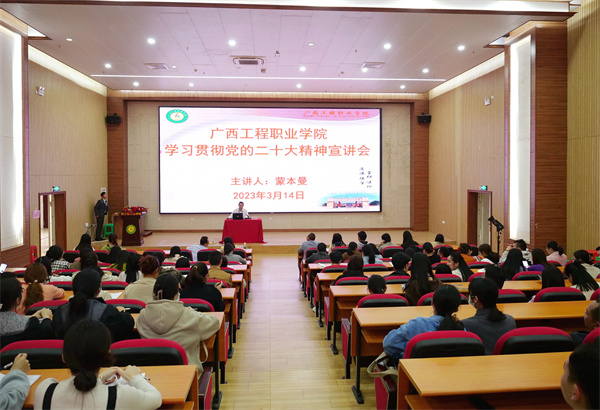 3月14日,學(xué)校在圖文信息大樓一樓學(xué)術(shù)報告廳舉行學(xué)習(xí)宣傳貫徹黨的二十大精神宣講報告會,學(xué)校黨委書記、督導(dǎo)專員蒙本曼作宣講報告。學(xué)校黨委副書記黃秋霞,紀(jì)委書記、副校長彭高彬,副校長吳先夏等學(xué)校領(lǐng)導(dǎo)出席宣講報告會,各黨(總)支部書記、各處室負責(zé)人、科級干部、黨員教師、輔導(dǎo)員、教師代表等400多人參加報告會。