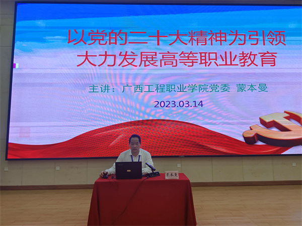 報告會上,蒙本曼總結(jié)了我國高等職業(yè)教育在40多年的發(fā)展歷程中經(jīng)歷的許多大事、完成的重要任務(wù),以及取得的一系列標(biāo)志性成果。他特別指出,進入新世紀(jì)后,在國家實施高等教育大眾化和加快發(fā)展職業(yè)教育的雙重政策推動下,持續(xù)出臺的“示范計劃”“雙高計劃”等高瞻遠矚的政策措施推動了高職教育實現(xiàn)了歷史性的發(fā)展,取得歷史性的成就。他強調(diào),職業(yè)教育是黨和政府高度重視和始終關(guān)心的一項民生事業(yè),在習(xí)近平總書記的系列重要講話和黨的二十大報告中,對進一步強化職業(yè)教育的表述鮮明而具體,如“統(tǒng)籌職業(yè)教育、高等教育、繼續(xù)教育協(xié)同創(chuàng)新,推進職普融通、產(chǎn)教融合、科教融匯、優(yōu)化職業(yè)教育類型定位”等,都為未來職業(yè)教育的發(fā)展提供了重要指引,也增強了師生對職業(yè)教育發(fā)展前景的信心。蒙本曼要求,全校黨員干部教師要以自信、團結(jié)、努力的精神風(fēng)貌,全力書寫建設(shè)壯美廣西和社會主義現(xiàn)代化國家新征程的職業(yè)教育新篇章。