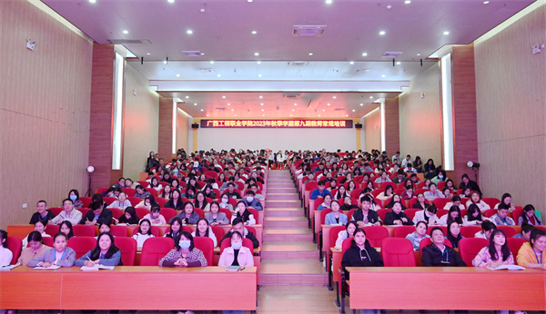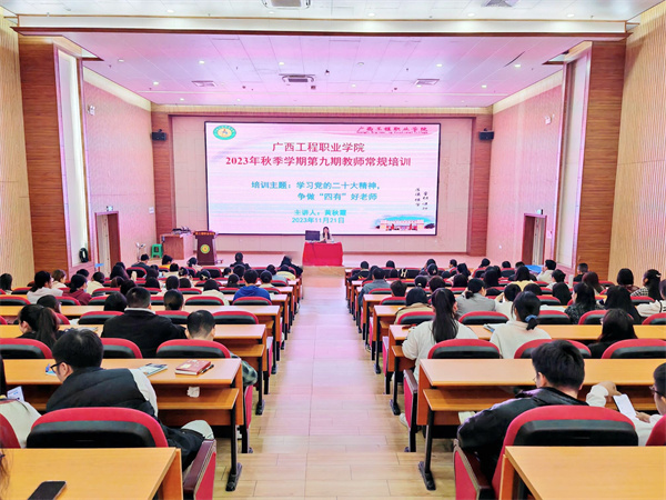 偉大的教育家雅斯貝爾斯曾說:“教育的本質(zhì)是一棵樹搖動另一棵樹,一朵云推動另一朵云,一個靈魂喚醒另一個靈魂。”為深入學(xué)習(xí)宣傳貫徹黨的二十大精神,加強(qiáng)學(xué)校師德師風(fēng)建設(shè),打造高素質(zhì)教師團(tuán)隊,引導(dǎo)廣大教師做“有理想信念、有道德情操、有扎實學(xué)識、有仁愛之心”的“四有”好老師,2023年11月21日,廣西工程職業(yè)學(xué)院舉行2023年秋季學(xué)期第九期教師常規(guī)培訓(xùn)會,黨委副書記黃秋霞作“學(xué)習(xí)黨的二十大精神,爭做‘四有’好老師”主題培訓(xùn)。全體教師參加了培訓(xùn)會。