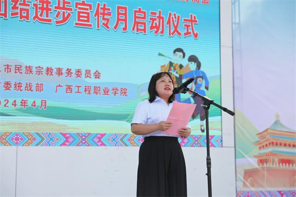 黨委副書(shū)記、校長(zhǎng)羅艷妮在致辭中向出席啟動(dòng)儀式的各位領(lǐng)導(dǎo)和嘉賓表示歡迎,向關(guān)心支持廣西工程職業(yè)學(xué)院民族團(tuán)結(jié)進(jìn)步事業(yè)的各級(jí)領(lǐng)導(dǎo)、各界人士和積極投身民族團(tuán)結(jié)進(jìn)步事業(yè)創(chuàng)建的廣大干部群眾、師生員工表示感謝。