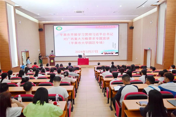 3月27日,平果市學(xué)習(xí)貫徹習(xí)近平總書記對(duì)廣西重大方略要求專題宣講(平果市大學(xué)園區(qū)專場(chǎng))在廣西工程職業(yè)學(xué)院圖文信息大樓報(bào)告廳舉行,平果市大學(xué)園區(qū)管理服務(wù)中心組織園區(qū)干部職工及園區(qū)內(nèi)3所高職院校師生代表300人到場(chǎng)學(xué)習(xí)。