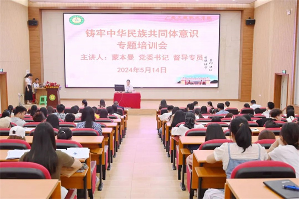 為不斷深化全校民族團結(jié)進步教育,鑄牢中華民族共同體意識,5月14日下午,我校在圖文信息大樓一樓學術(shù)報告廳舉行鑄牢中華民族共同體意識專題培訓會。紀委書記、副校長彭高彬,黨委副書記黃秋霞,各黨組織書記,各部門負責人、行政人員及專任教師代表400余人參加。黨委書記、督導專員蒙本曼作專題培訓。