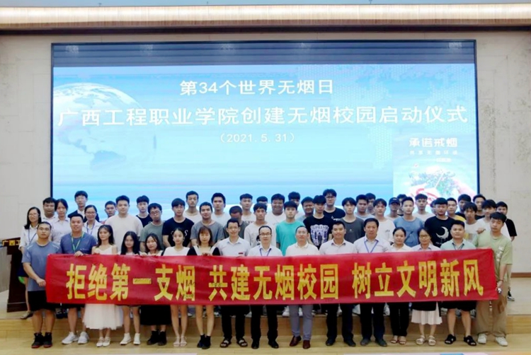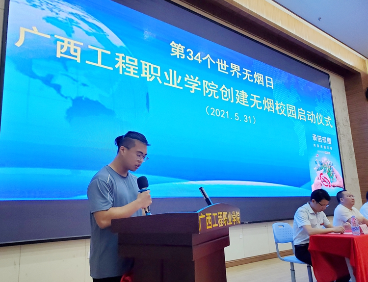 2021年5月31日是第34個(gè)世界無煙日,我校在圖文信息大樓報(bào)告廳舉行廣西工程職業(yè)學(xué)院創(chuàng)建無煙校園啟動(dòng)儀式。學(xué)校黨委委員、副校長、宣傳部部長彭高彬,副校長吳先夏,學(xué)生工作處副處長吳發(fā)德,保衛(wèi)處副處長盧保日,后勤管理中心副處長劉兆兵,以及團(tuán)委、各二級學(xué)院負(fù)責(zé)人出席儀式。各二級學(xué)院學(xué)生代表約300人參加啟動(dòng)儀式。啟動(dòng)儀式由汽車與機(jī)電學(xué)院學(xué)生白一凡主持。