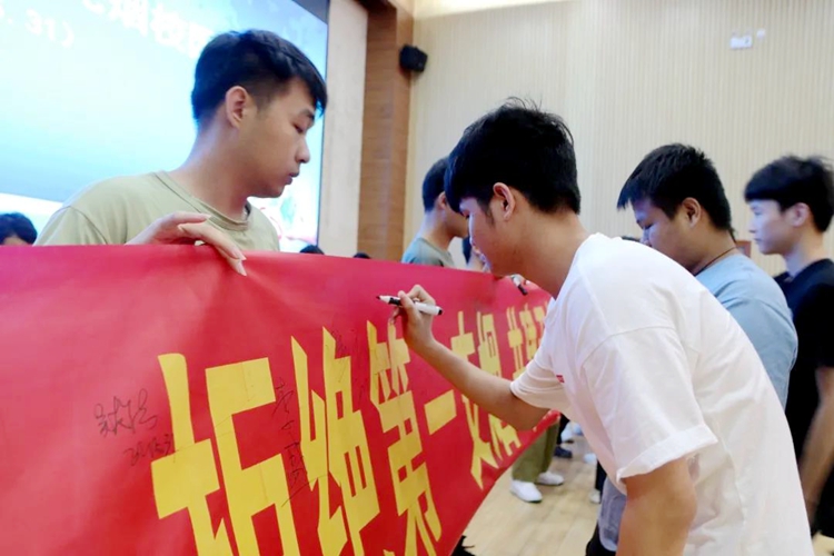參加儀式的領(lǐng)導(dǎo)、老師及學(xué)生代表紛紛上臺,在“拒絕第一支煙,共建文明校園”橫幅上簽字。