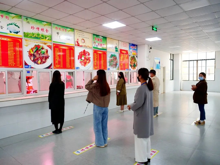食堂工作人員在中午放學(xué)前在飯?zhí)瞄T口執(zhí)勤并且組織學(xué)生先洗手,從正門有序排隊(duì)量體溫,學(xué)生隔開(kāi)入座就餐。就餐時(shí)摘掉舊口罩放至醫(yī)療垃圾桶,餐后清理桌面,并帶上新口罩。
