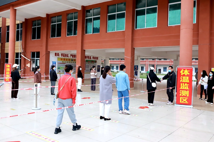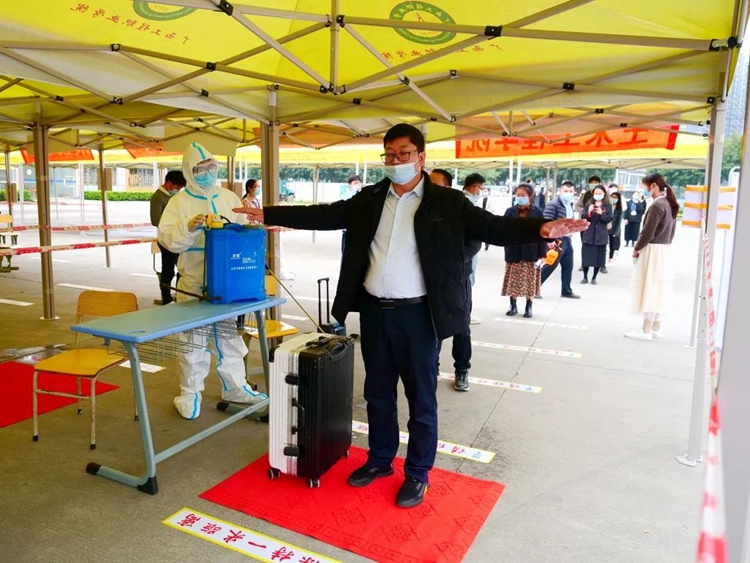 各組工作人員提前到崗,互測(cè)體溫并進(jìn)行記錄。返校學(xué)生按照規(guī)定在校門外排隊(duì)、掃碼、測(cè)溫、行李消殺等。值班人員在指定位置迎接學(xué)生入校,并持續(xù)觀看紅外線熱感測(cè)溫儀的監(jiān)測(cè)數(shù)據(jù),若發(fā)現(xiàn)異常情況,則由校醫(yī)將該學(xué)生帶至臨時(shí)隔離區(qū),并通知上級(jí)防控中心。