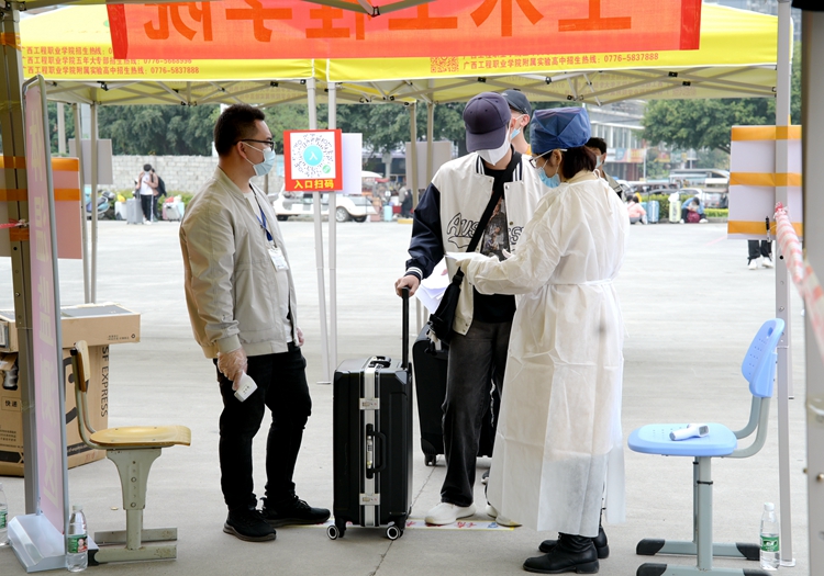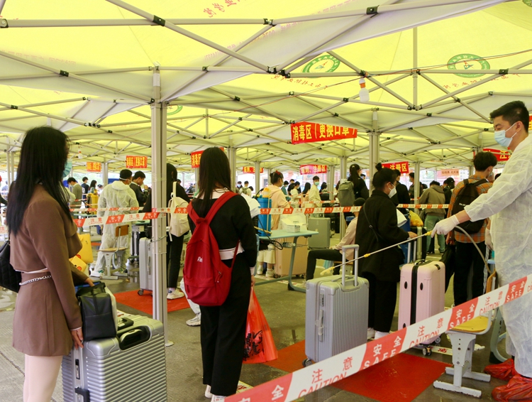 開(kāi)學(xué)返校期間,學(xué)校門(mén)口設(shè)置隔離通道,工作人員引導(dǎo)學(xué)生間隔1米安全距離有序排隊(duì),經(jīng)行李消殺、核驗(yàn)48小時(shí)核酸檢測(cè)陰性證明、大數(shù)據(jù)行程卡、健康碼、更換口罩、體溫檢測(cè)、返校材料核驗(yàn)等一切正常后登記注冊(cè),學(xué)生進(jìn)入校園,在工作人員的引導(dǎo)下,有序到魯班廣場(chǎng)進(jìn)行核酸檢測(cè),隨后前往宿舍區(qū),由公寓管理員再次為學(xué)生測(cè)溫后辦理入住手續(xù)。整個(gè)流程有條不紊,報(bào)到現(xiàn)場(chǎng)秩序井然。