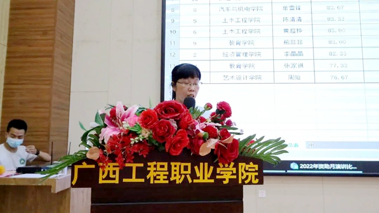 比賽結(jié)束后,黃秋霞副書記對(duì)比賽進(jìn)行點(diǎn)評(píng)總結(jié)。她對(duì)本次比賽給予充分肯定,并就選手的演講內(nèi)容、表達(dá)技巧、精神面貌等方面進(jìn)行點(diǎn)評(píng),提出了建議和意見。同時(shí),號(hào)召同學(xué)們要牢記習(xí)近平總書記的囑托,做理想遠(yuǎn)大、信念堅(jiān)定的模范,做刻苦學(xué)習(xí)、銳意創(chuàng)新的模范,做敢于斗爭(zhēng)、善于斗爭(zhēng)的模范,做艱苦奮斗、無私奉獻(xiàn)的模范,做崇德向善、嚴(yán)守紀(jì)律的模范。為實(shí)現(xiàn)個(gè)人的青春夢(mèng)、學(xué)校“升本夢(mèng)”和中華民族偉大復(fù)興的中國(guó)夢(mèng)砥礪前行,努力奮斗!用實(shí)際行動(dòng)追夢(mèng)鑄夢(mèng),不負(fù)黨和人民的殷切期望,以實(shí)際行動(dòng)回報(bào)父母、回報(bào)學(xué)校、回報(bào)社會(huì)、回報(bào)國(guó)家。