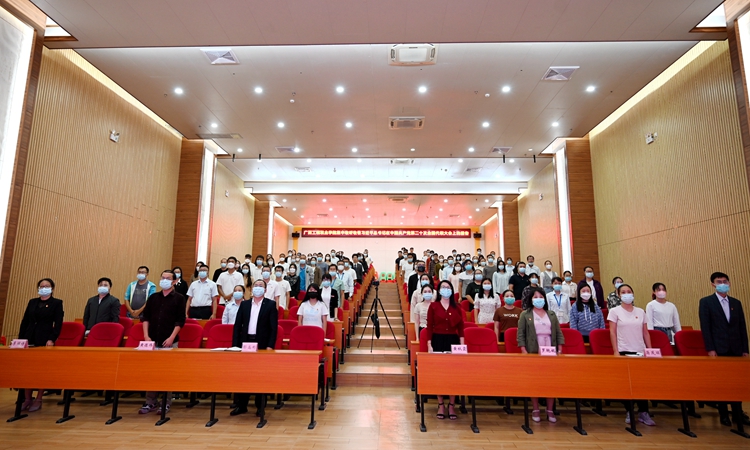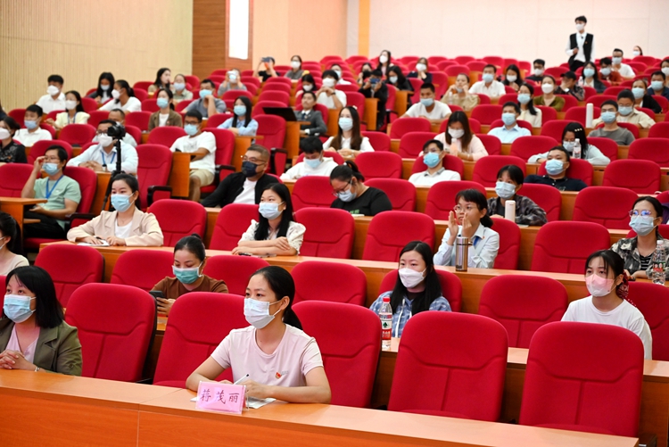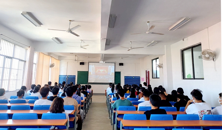 學(xué)校領(lǐng)導(dǎo)及教師代表在圖文信息大樓報(bào)告廳收聽收看黨的二十大開幕會(huì)盛況