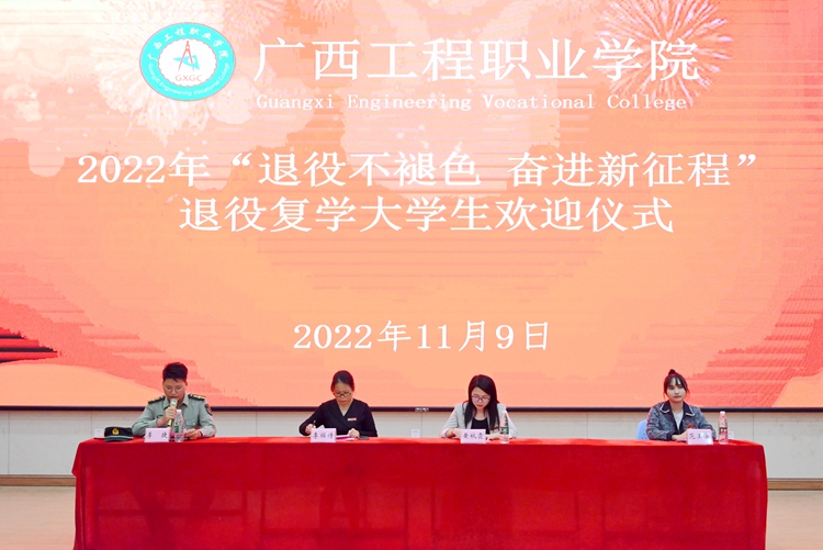 為弘揚廣西工程職業(yè)學院學子積極參軍、報效祖國的優(yōu)良傳統(tǒng),營造尊崇軍人濃厚氛圍,進一步做好退役復學學生的服務工作,11月9日下午,學校在圖文信息大樓一樓學術報告廳召開了2022年退役復學大學生“退役不褪色 奮進新征程”歡迎會。黨委副書記黃秋霞,黨委委員、學生工作處副處長李麗詩,國防科技學院副院長李捷、學工處資助科科長范玉翠出席歡迎儀式,各二級學院學生科長、22級輔導員及2022年退役復學大學生參加了歡迎儀式。李捷副院長主持儀式。