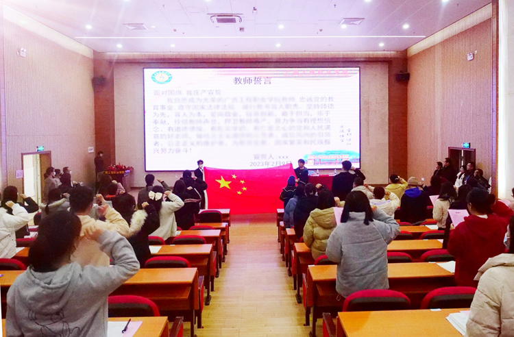 開班儀式上,由新教師代表鄧金篇帶領(lǐng)全體新教師進(jìn)行莊嚴(yán)宣誓,新教師們承諾在今后的工作中,將會忠誠黨的教育事業(yè),履行教書育人職責(zé),引領(lǐng)學(xué)生健康成長,做到有理想信念、有道德情操、有扎實學(xué)識、有仁愛之心,為教育發(fā)展、國家繁榮和民族振興努力奮斗!