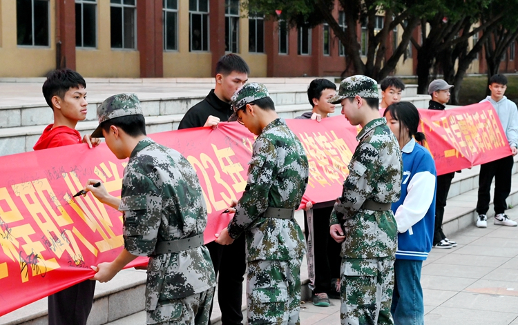 2023年三月學雷鋒活動啟動后,參加儀式的師生紛紛在活動主題背景墻簽名。