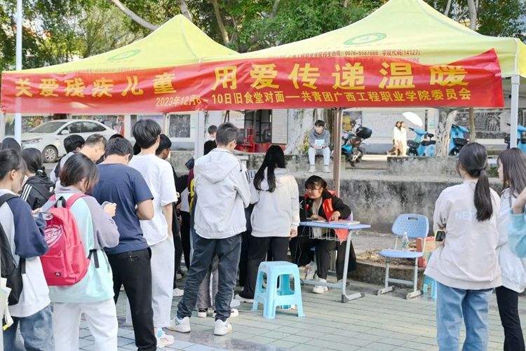 扶弱助殘是中華民族的傳統(tǒng)美德,為給殘疾兒童營造充滿關(guān)愛、健康成長的生活環(huán)境,讓他們與健全兒童共享陽光雨露,同在藍天下快樂成長,2023年12月8日-10日,廣西工程職業(yè)學院在綜合食堂服務區(qū)開展“關(guān)愛殘疾兒童,用愛傳遞溫暖”捐贈活動。廣大師生積極參與,傳播扶殘助殘兒童的正能量,他們以實際行動向需要幫助的殘疾兒童給予援助之手,為公益事業(yè)貢獻出自己的一份綿薄之力。