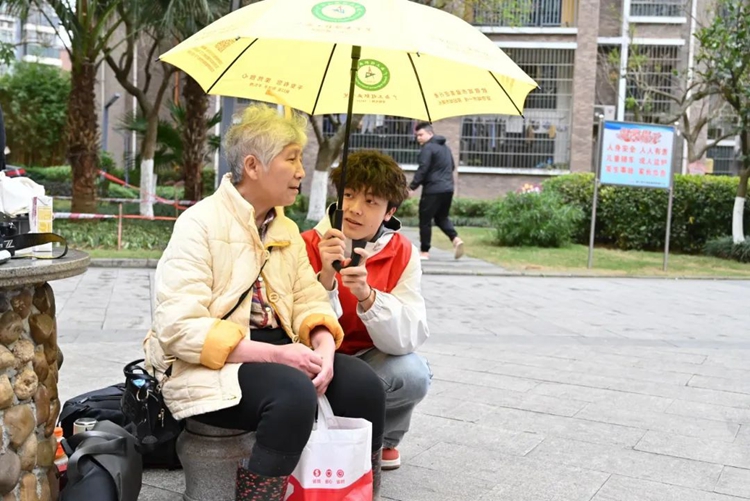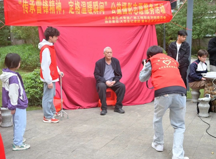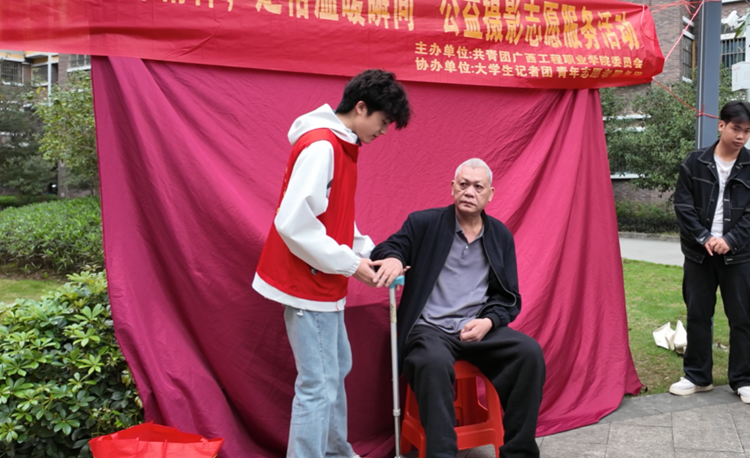 社區(qū)的老人們在志愿者的攙扶下,緩緩走向拍攝區(qū)域,即將留下這美好的瞬間。