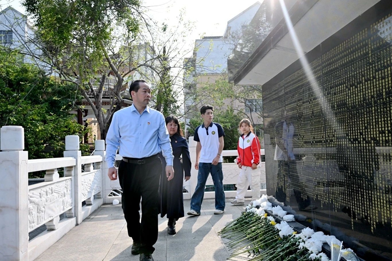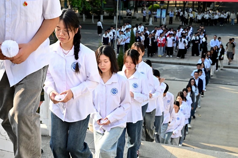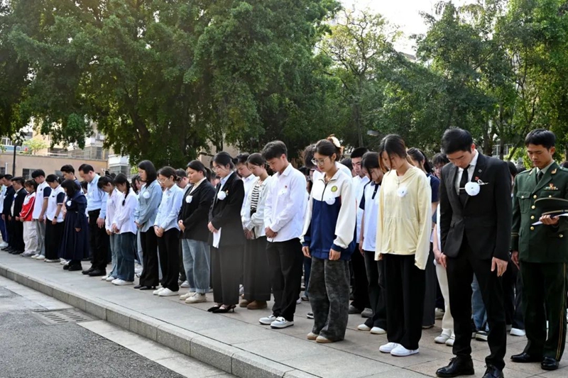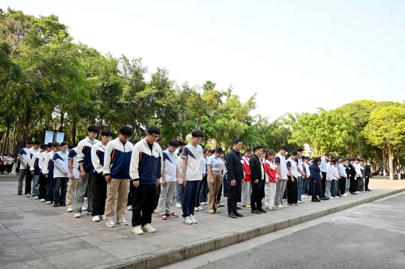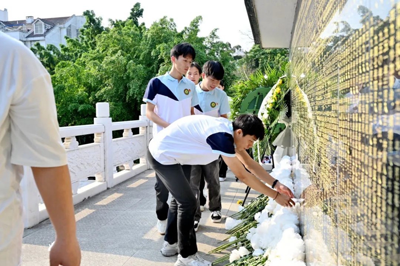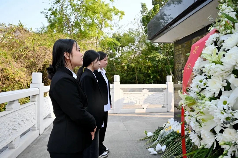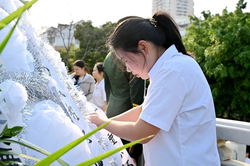 圖為全體師生依次走上瞻仰臺(tái),向革命先烈敬獻(xiàn)小白花