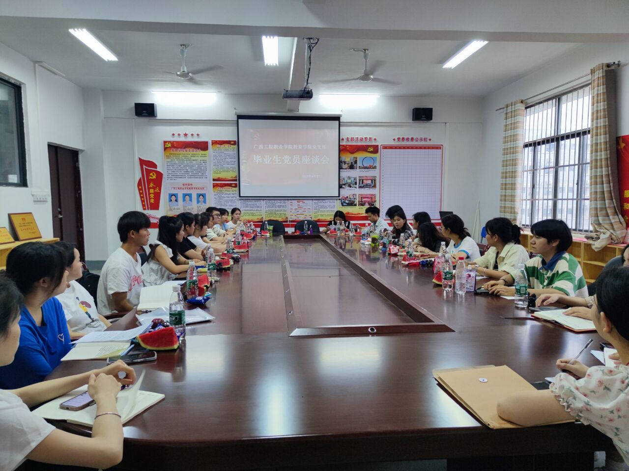 教育學(xué)院黨支部委員會與參會學(xué)生親切交流,并聽取了畢業(yè)生黨員對學(xué)校黨員教育工作的意見和建議。