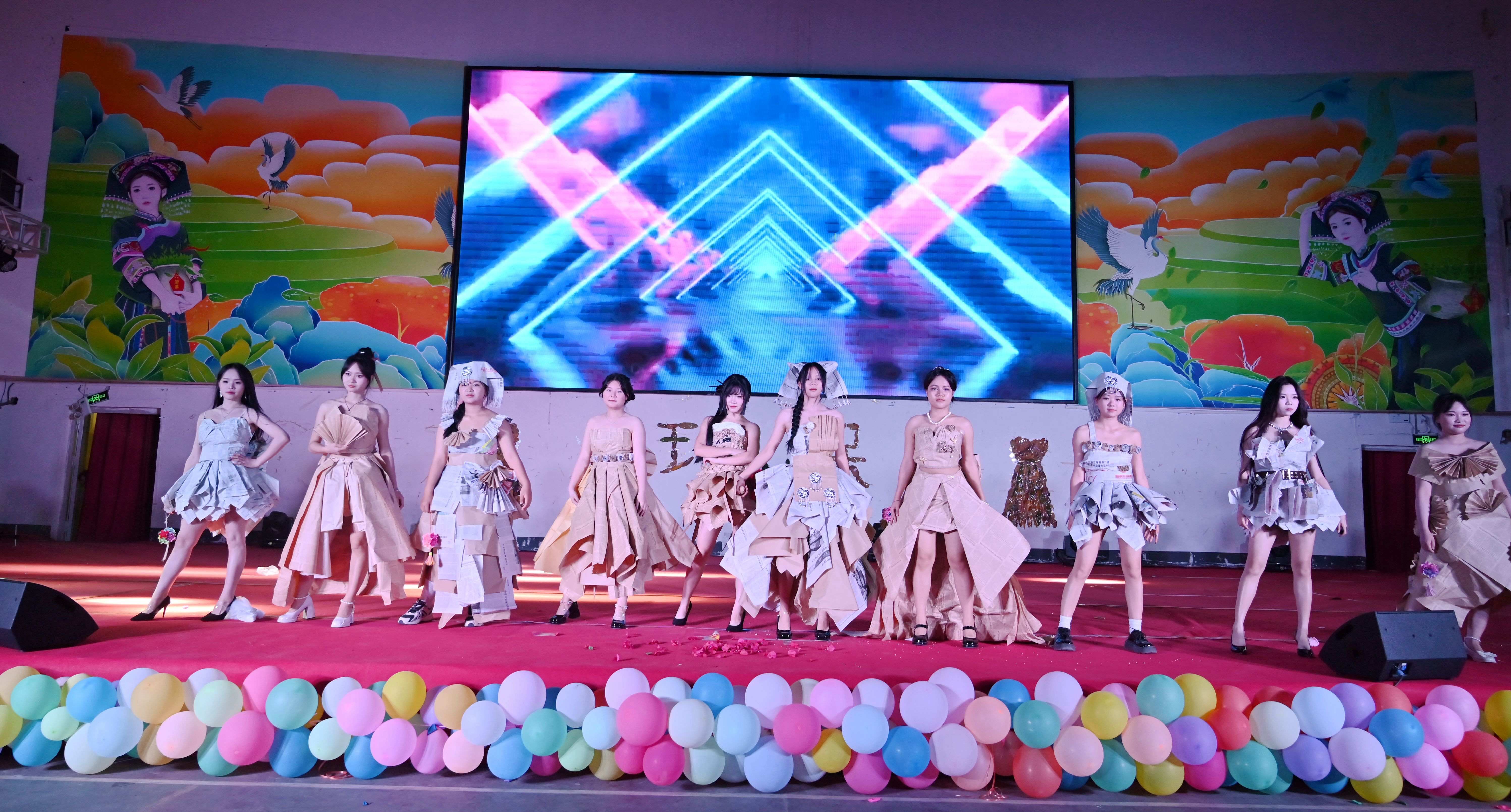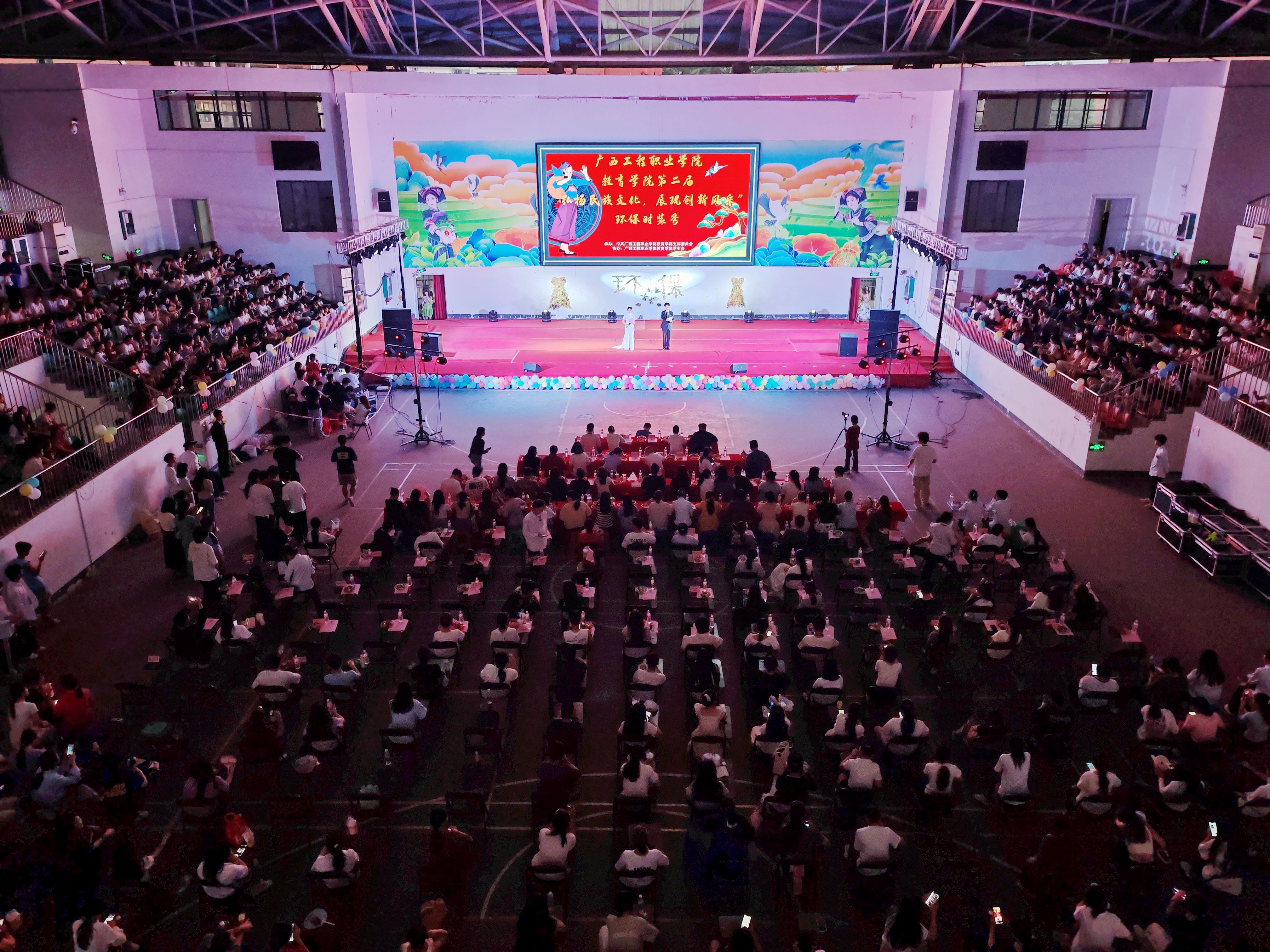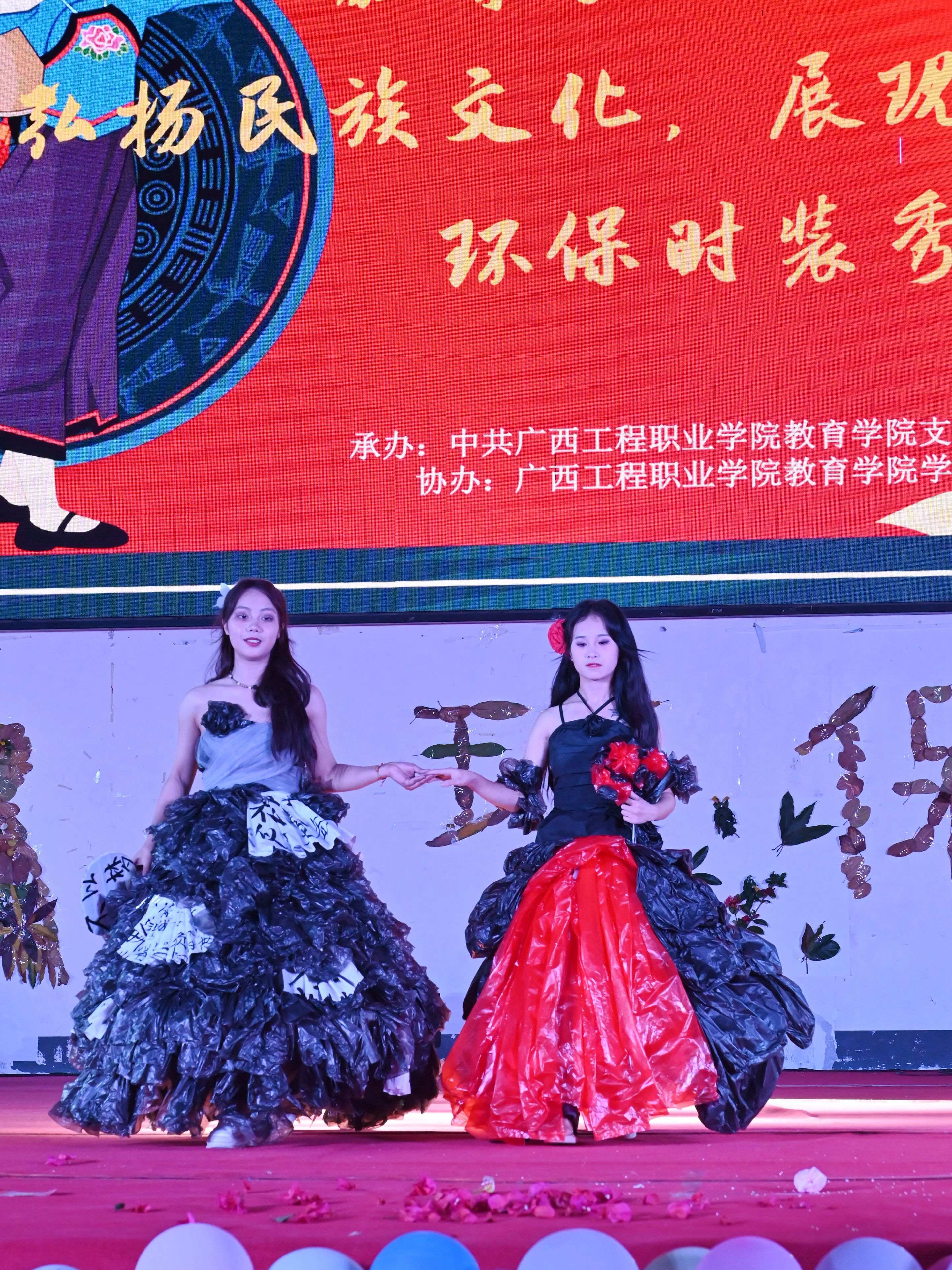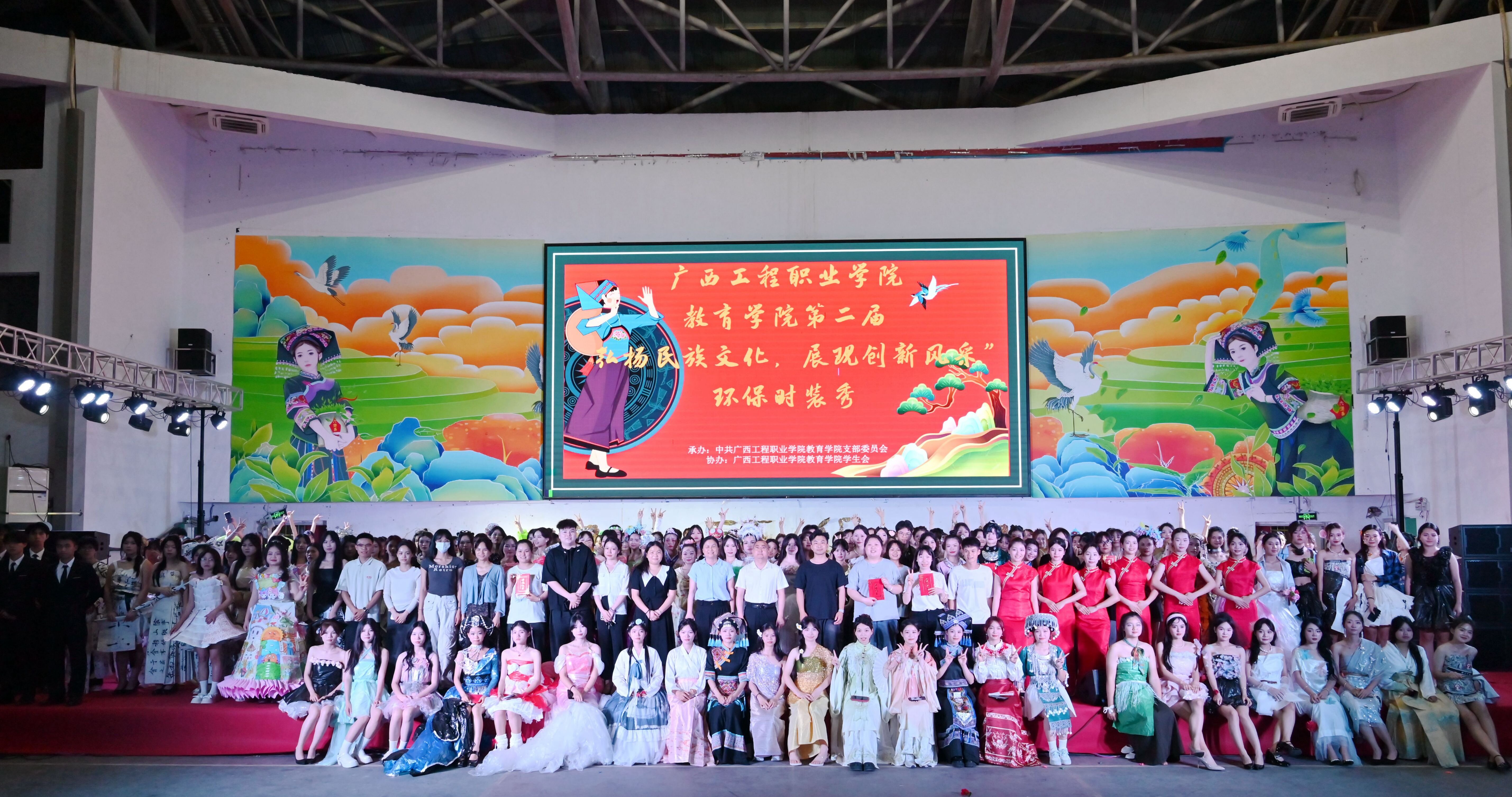 2024年4月2日晚,廣西工程職業(yè)學(xué)院教育學(xué)院在體育館舉行第二屆“弘揚(yáng)民族文化,展現(xiàn)創(chuàng)新風(fēng)采”環(huán)保時(shí)裝秀。學(xué)校副董事長(zhǎng)林艷,紀(jì)委書記、副校長(zhǎng)彭高彬,校長(zhǎng)助理梁善雅,教育學(xué)院黨支部書記、院長(zhǎng)梁鳳琴等領(lǐng)導(dǎo)干部出席活動(dòng)現(xiàn)場(chǎng),教育學(xué)院全體教師及各學(xué)院學(xué)生代表到現(xiàn)場(chǎng)觀看環(huán)保時(shí)裝秀。
