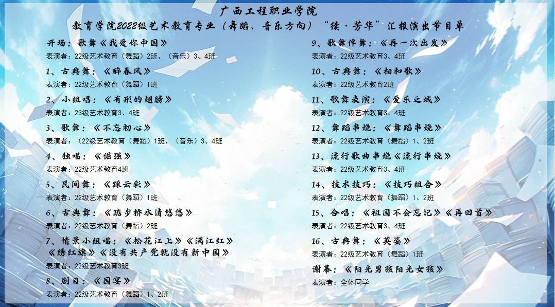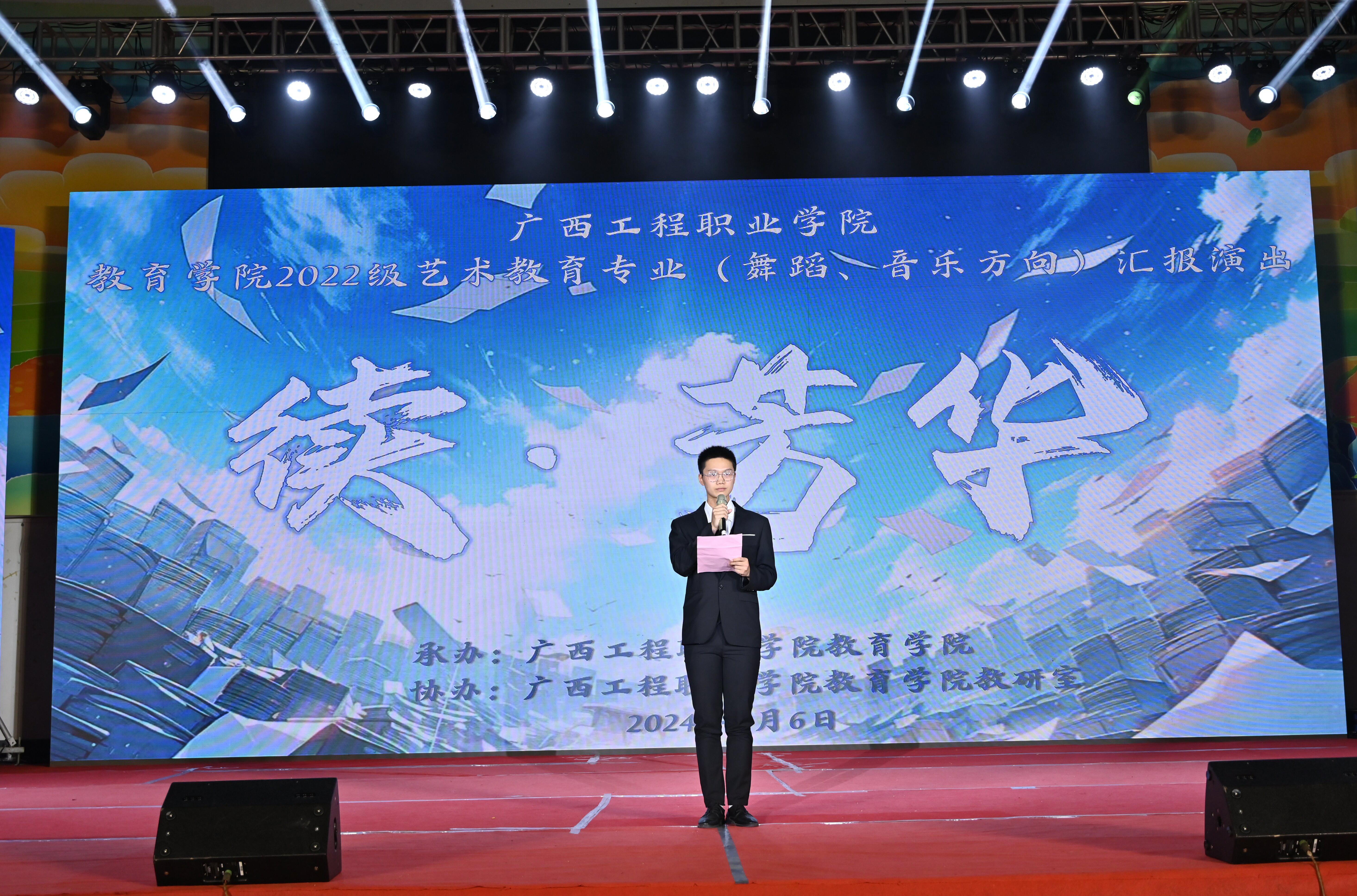 教育學(xué)院黨支部書記、院長梁鳳琴致辭,她希望通過匯演展現(xiàn)同學(xué)們的藝術(shù)風(fēng)采,提高同學(xué)們的舞臺表演能力。同時(shí)可以更好激發(fā)班級的潛力,調(diào)動(dòng)團(tuán)隊(duì)的激情與活力,提高同學(xué)們的專業(yè)水平。藝術(shù),是我們生活中不可或缺的一部分,它如同一束璀璨的光芒,照亮了我們的精神世界。舞蹈與音樂,更是藝術(shù)領(lǐng)域中兩顆耀眼的明珠。舞蹈,是身體的詩篇,是情感的流淌。它無需言語,卻勝過千言萬語。音樂,是心靈的旋律,是情感的共鳴。它跨越時(shí)空,直抵人心。當(dāng)舞蹈與音樂相遇,它們便如同烈火遇干柴,迸發(fā)出耀眼的光芒,釋放出無盡的能量。同學(xué)們通過無數(shù)個(gè)日夜的辛勤努力和刻苦訓(xùn)練,才得以在今天的舞臺上綻放光芒。你們用靈動(dòng)的舞姿展現(xiàn)著身體的韻律,用美妙的音符傳遞著內(nèi)心的情感。每一個(gè)動(dòng)作、每一段旋律,都凝聚著你們的汗水與夢想,這是你們芳華歲月里最絢麗的篇章。希望你們能以此次匯報(bào)演出為新的起點(diǎn),繼續(xù)在藝術(shù)的道路上不懈追求,不斷超越自我,用你們的才華和熱情去書寫更加輝煌的未來。同時(shí),也希望全體師生能一如既往地支持和推動(dòng)藝術(shù)教育的發(fā)展,讓藝術(shù)之花在我們的校園里永遠(yuǎn)綻放。