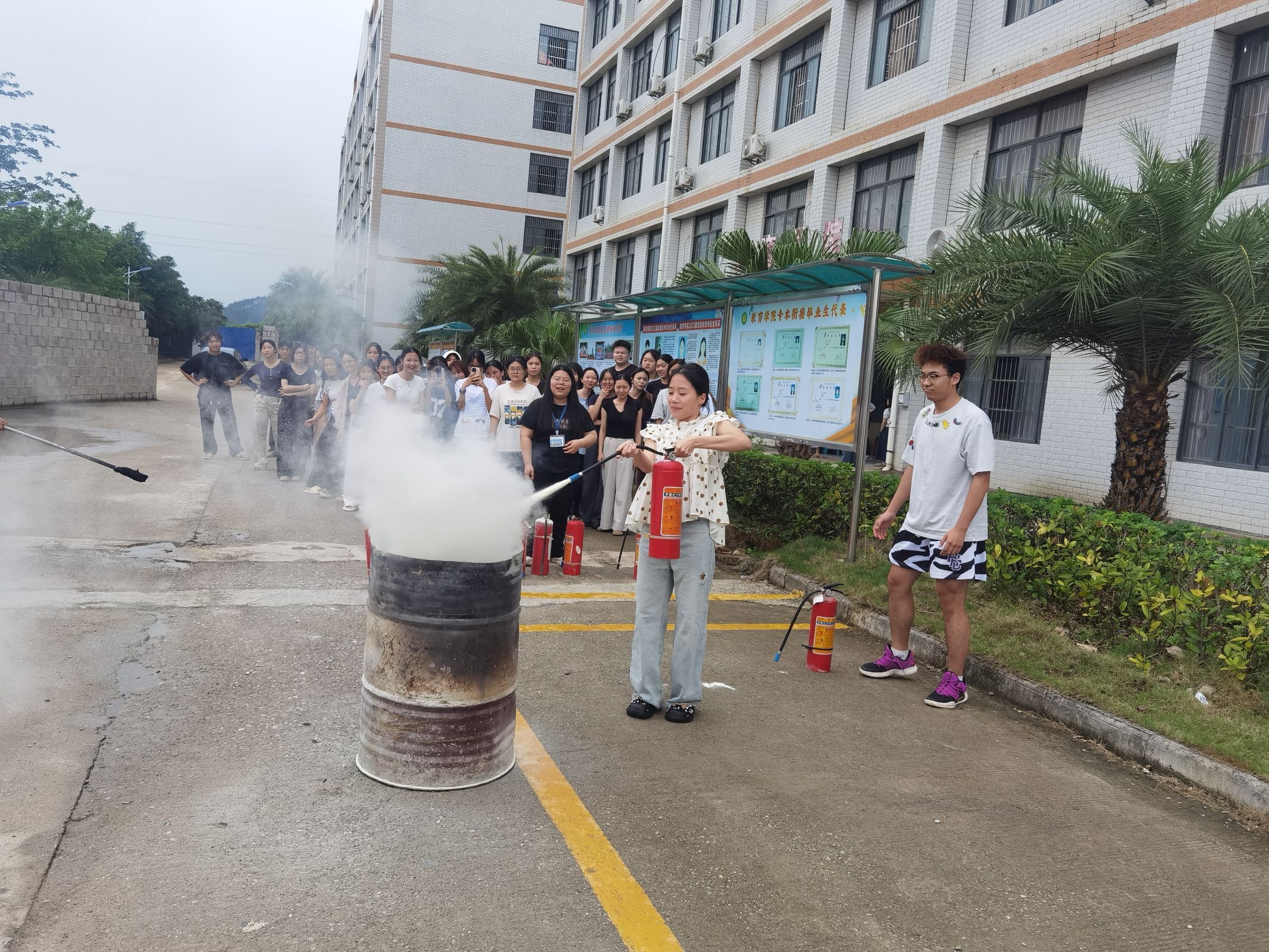 疏散演練結(jié)束后,進入消防滅火技能演練環(huán)節(jié)。設備管理員現(xiàn)場講解并演示滅火器、消火栓等消防器材的正確使用方法,詳細介紹火災預防、初期撲救及逃生自救等消防安全知識。隨后,師生們踴躍參與實操,在專業(yè)人員指導下,成功撲滅模擬火源,切實掌握滅火技能。?