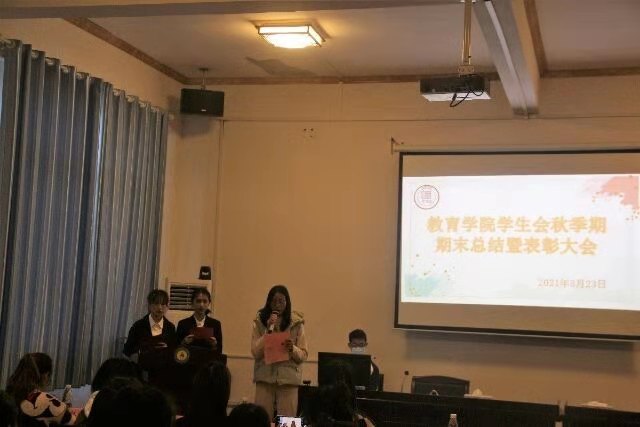 主持人宣讀工作積極分子名單,由教育學(xué)院分團(tuán)委書記謝安妮老師頒發(fā)證書