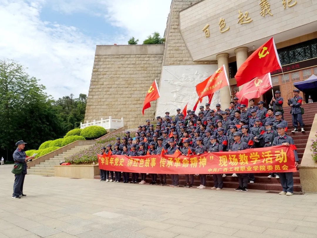 最后一站來到百色起義紀(jì)念館,在百色起義紀(jì)念館大門階梯上,全體黨員身著紅軍裝,整齊肅立,再次聆聽學(xué)校黨委副書記、副校長胡細木為大家講述“百色起義歷史及紅色故事”。隨后,集體參觀學(xué)習(xí)了百色起義歷史展館廳、英烈廳等展廳。一個一個的紅色革命故事,一件一件的紅色革命文物,洗滌和凈化了我們內(nèi)心深處的靈魂,更加堅定了我們在新時代賡續(xù)紅色血脈、傳承紅色精神的理想信念。