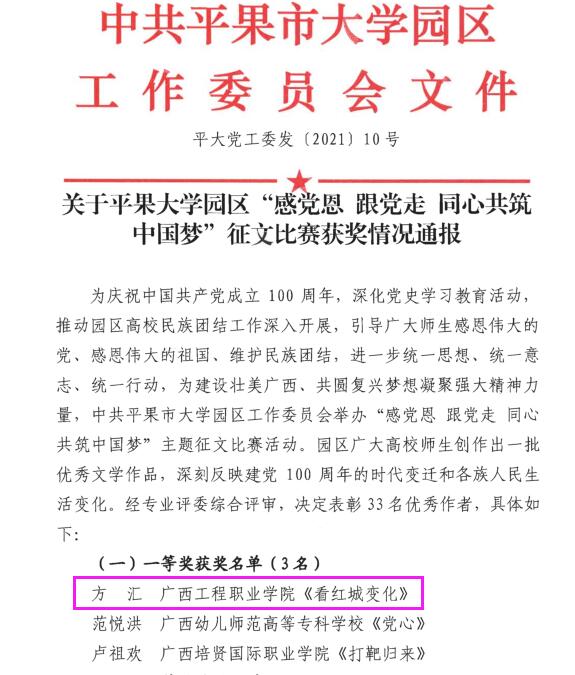 為慶祝中國共產(chǎn)黨成立100周年,深化黨史學(xué)習(xí)教育,2021年4月由中共平果市大學(xué)園區(qū)工作委員會(huì)舉辦的“感黨恩跟黨走同心共筑中國夢(mèng)”征文比賽,我院2019級(jí)物業(yè)1班方匯撰寫的《紅城變化》在眾多的參賽選手中脫穎而出,榮獲此次征文比賽一等獎(jiǎng),希望廣大師生向獲獎(jiǎng)的同志學(xué)習(xí),發(fā)揮自己的才智,為學(xué)校爭(zhēng)取更多的榮譽(yù)!