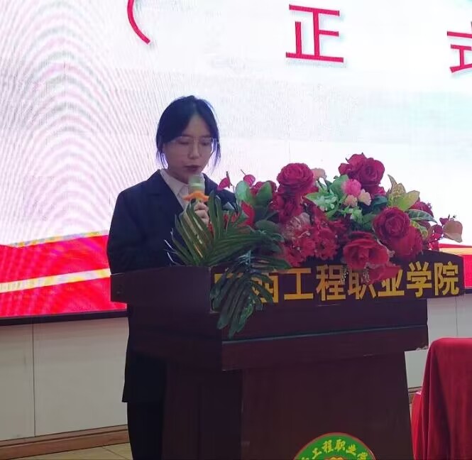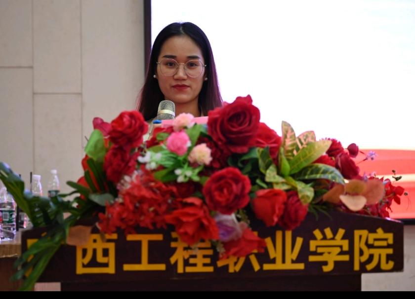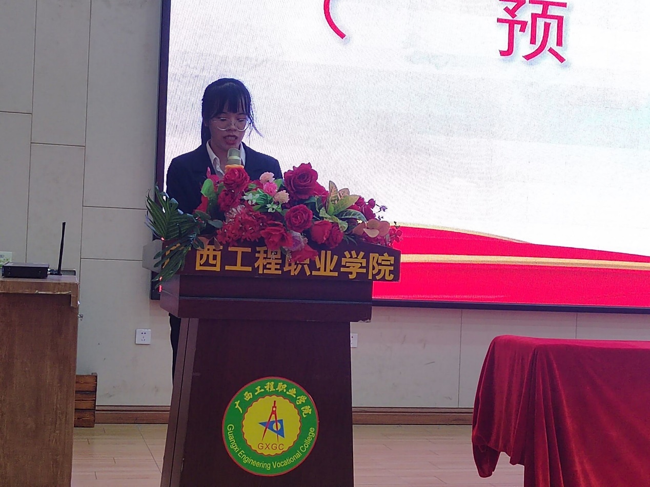 經(jīng)濟管理學院輔導員楊尚晶宣讀廣西工程職業(yè)學院經(jīng)濟管理學院第十五次學生代表大會總監(jiān)票人、監(jiān)票人、總計票人、計票人名單(草案)