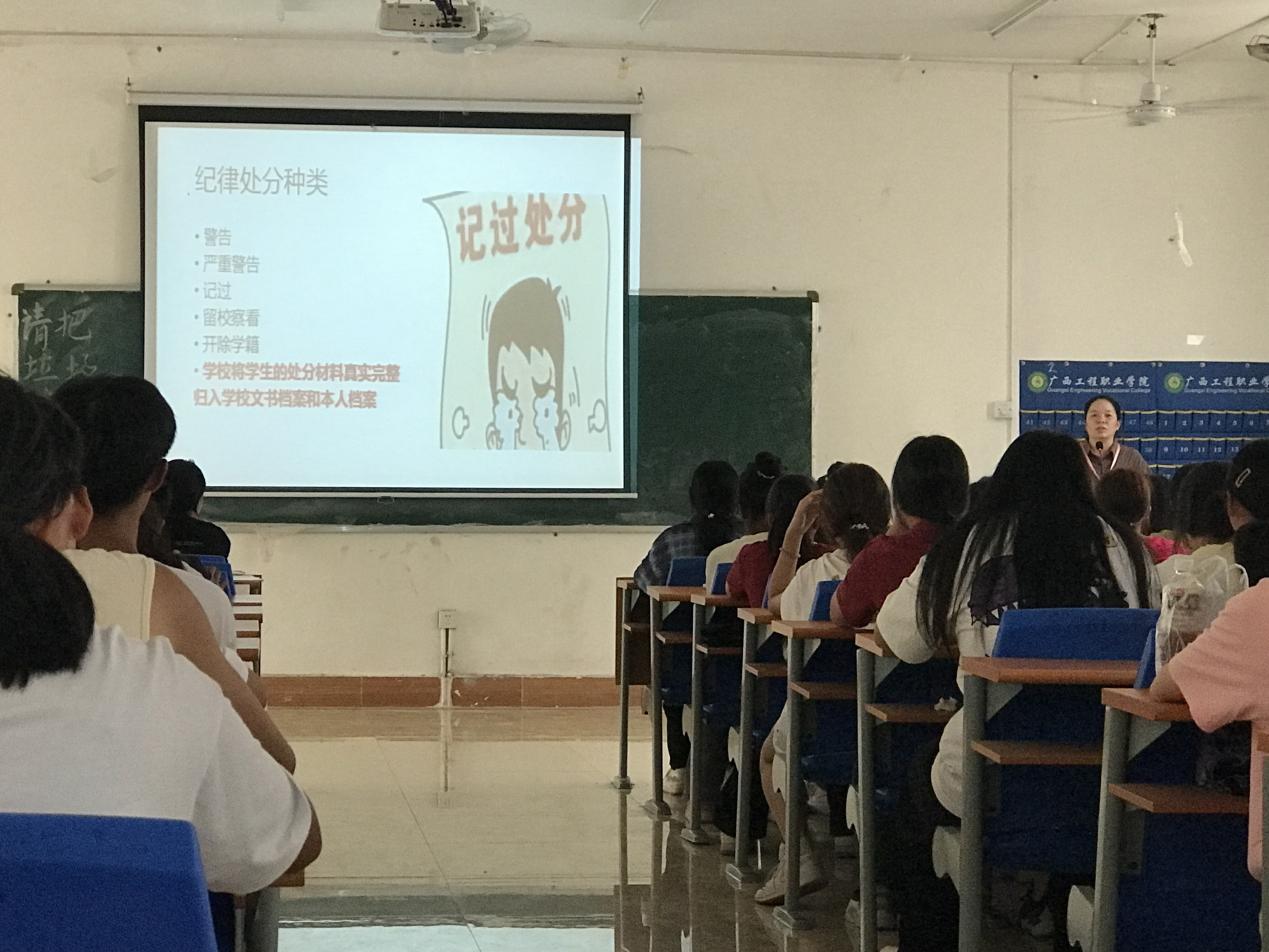為全面貫徹黨的教育方針,維護學校正常的教學、生活秩序,從嚴治校,促進學生成為有理想、有道德、有文化、有紀律的社會主義事業(yè)接班人。同時也讓2023級新生能快速了解學校管理規(guī)定,知曉學校管理紅線和底線。根據(jù)學校入學教育課程計劃,結(jié)合學院實際,學院于2023年9月27日下午在經(jīng)濟管理學院102教室開展主題為《廣西工程職業(yè)學院學生違紀處分管理規(guī)定》的專題培訓。本次培訓由經(jīng)濟管理學院黨支部副書記潘翠萍老師做專題培訓。