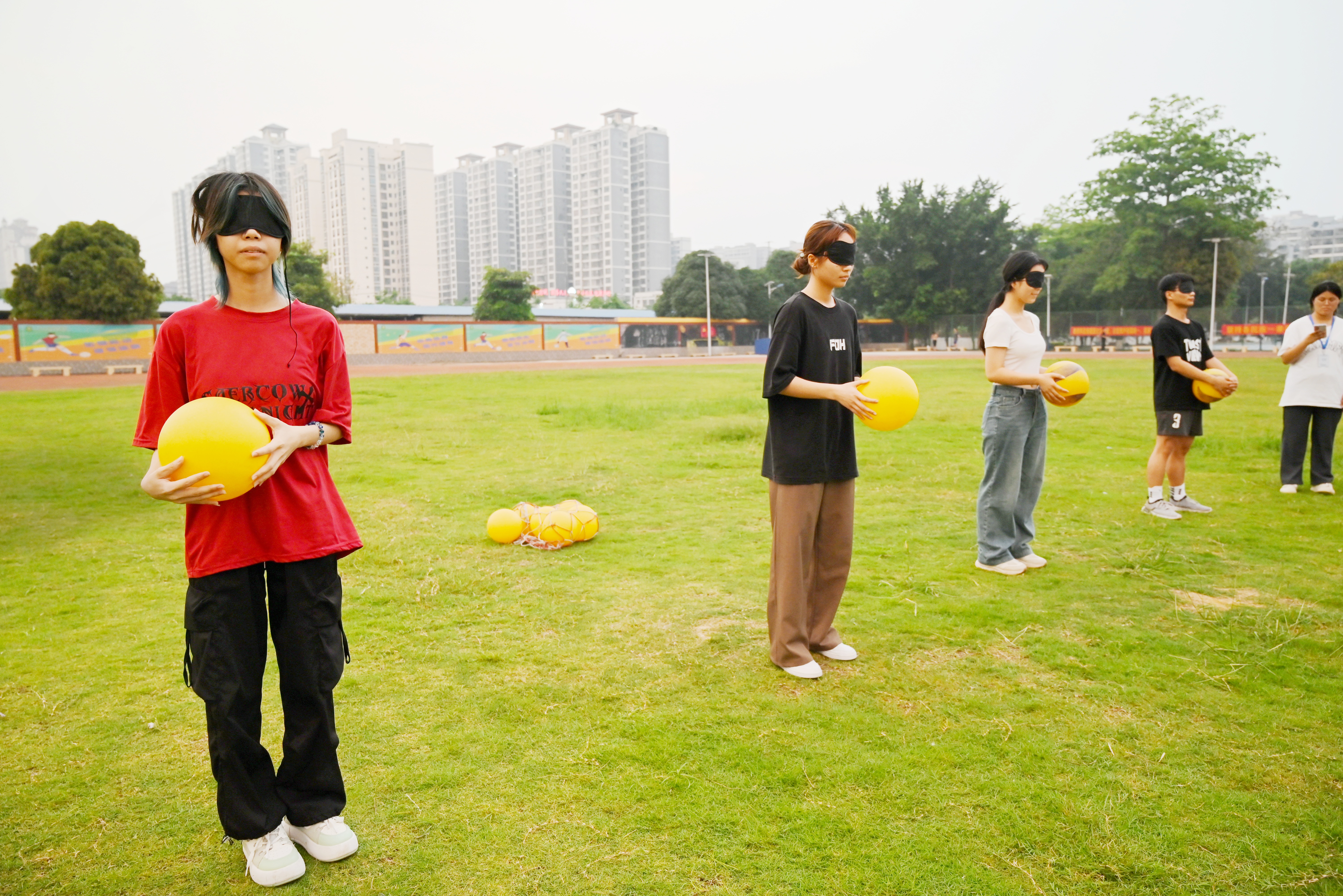 項(xiàng)目三:趣味投籃,兩個(gè)一隊(duì)每隊(duì)中選出一人蒙眼往籃子里投球,另一人坐在椅子上,通過(guò)語(yǔ)言表達(dá)指揮面前的隊(duì)友向籃子投球,完成速度最快隊(duì)伍獲得獎(jiǎng)品。
