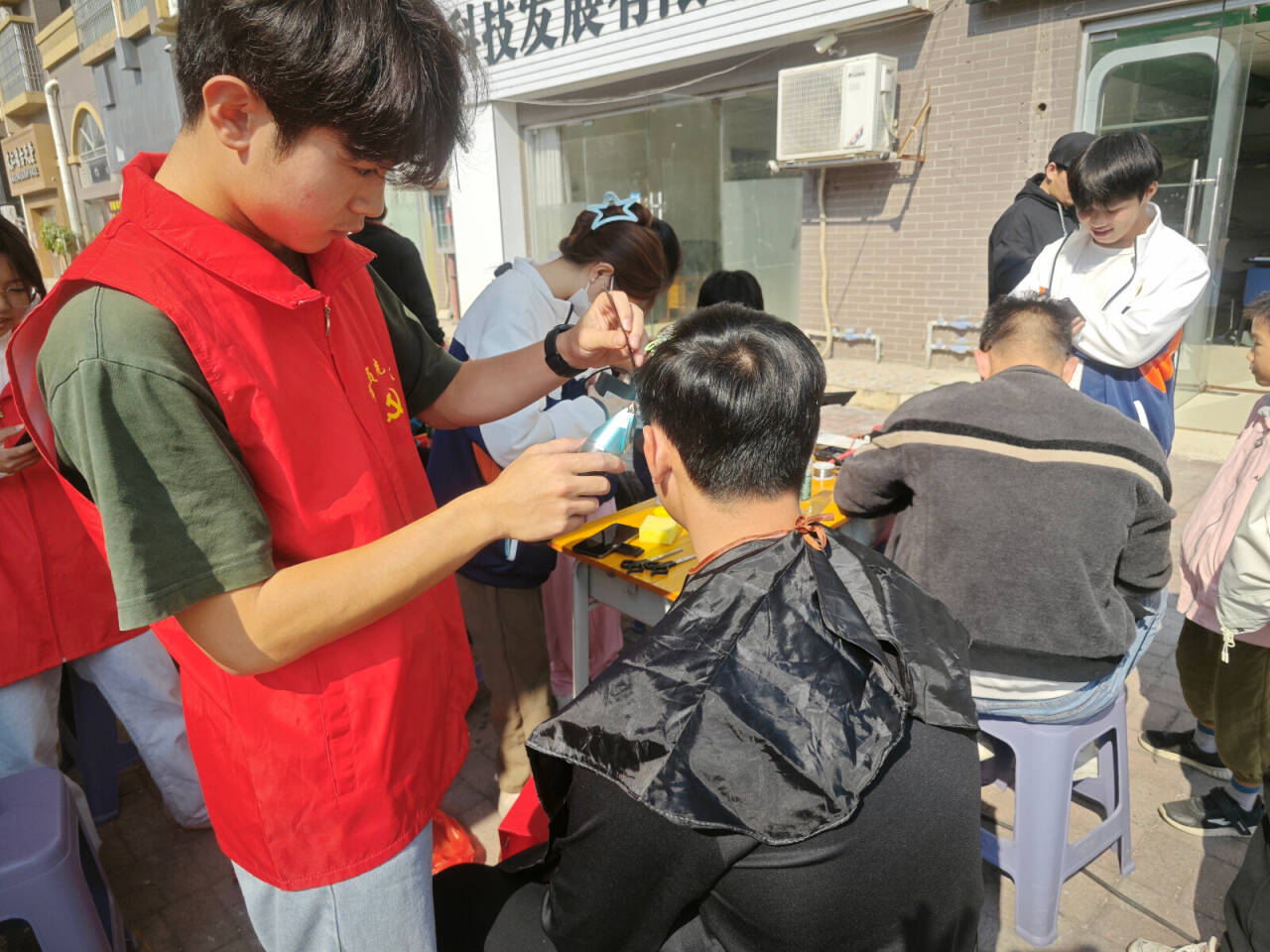 圖為師生們?cè)跒樯鐓^(qū)群眾義務(wù)理發(fā)
