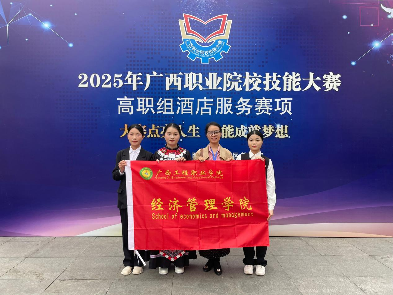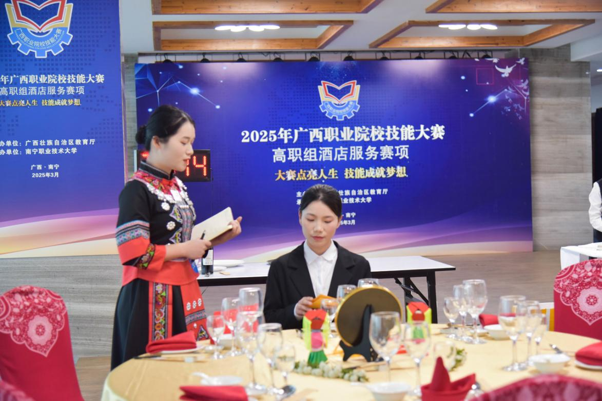 2025年廣西職業(yè)院校技能大賽(高職組)《酒店服務(wù)》賽項于3月14日至16日在南寧職業(yè)技術(shù)大學(xué)舉行,各校代表隊共23個。彭麗文、謝錫潔、盧桂玉老師指導(dǎo)23級酒店管理與數(shù)字化運營專業(yè)劉春雨、謝詩蕊、李雨珍3名同學(xué)參加了此次比賽。通過本項目競賽,使得學(xué)生能熟練掌握酒店前廳客房預(yù)訂、入住辦理流程、中餐主題宴會設(shè)計及宴會酒水服務(wù)、中餐點餐服務(wù)、中餐上菜服務(wù)、西餐廳酒水服務(wù)、西餐點餐服務(wù)、西餐上菜服務(wù)、酒店服務(wù)專業(yè)英語口語交流等業(yè)務(wù)技能,實現(xiàn)對學(xué)生團隊協(xié)同創(chuàng)新能力、溝通能力、專業(yè)技能水平及專業(yè)崗位能力的綜合素質(zhì)檢驗。