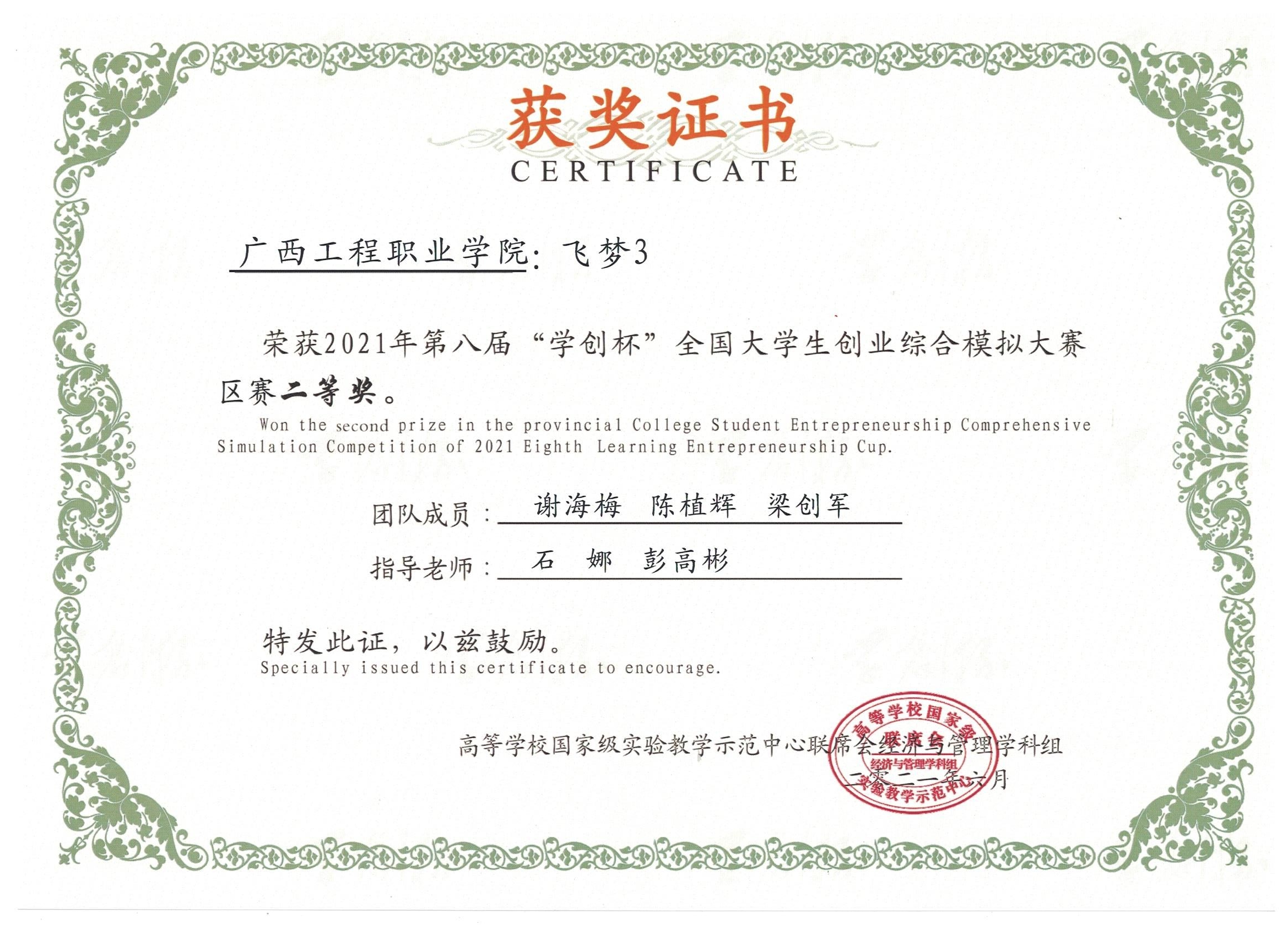 喜訊:我院學(xué)生參加2021年第八屆“學(xué)創(chuàng)杯”全國大學(xué)生創(chuàng)新創(chuàng)業(yè)綜合模擬大賽廣西選拔賽中榮獲高職組一等獎2項(xiàng),二等獎1項(xiàng)