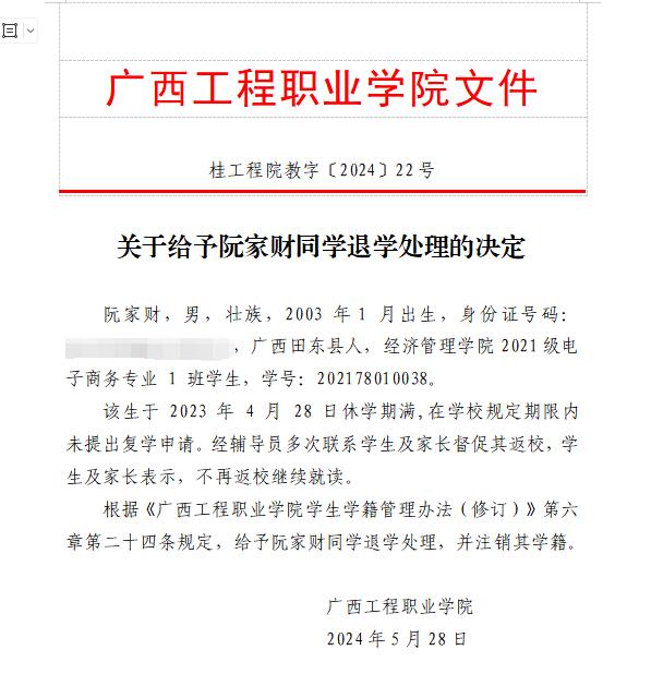根據(jù)《普通高等學(xué)校學(xué)生管理規(guī)定》(教育部令第41號(hào))、《廣西工程職業(yè)學(xué)院學(xué)生學(xué)籍管理辦法(修訂)》第二十四條規(guī)定,給予阮家財(cái)同學(xué)退學(xué)處理,并注銷(xiāo)其學(xué)籍。