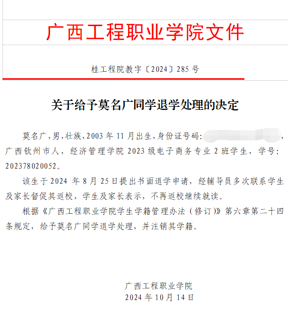 根據(jù)《普通高等學(xué)校學(xué)生管理規(guī)定》(教育部令第41號(hào))、《廣西工程職業(yè)學(xué)院學(xué)生學(xué)籍管理辦法(修訂)》第二十四條規(guī)定,給予莫名廣同學(xué)退學(xué)處理,并注銷其學(xué)籍。