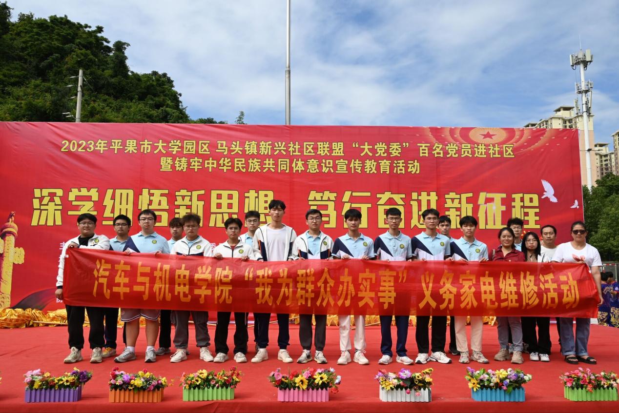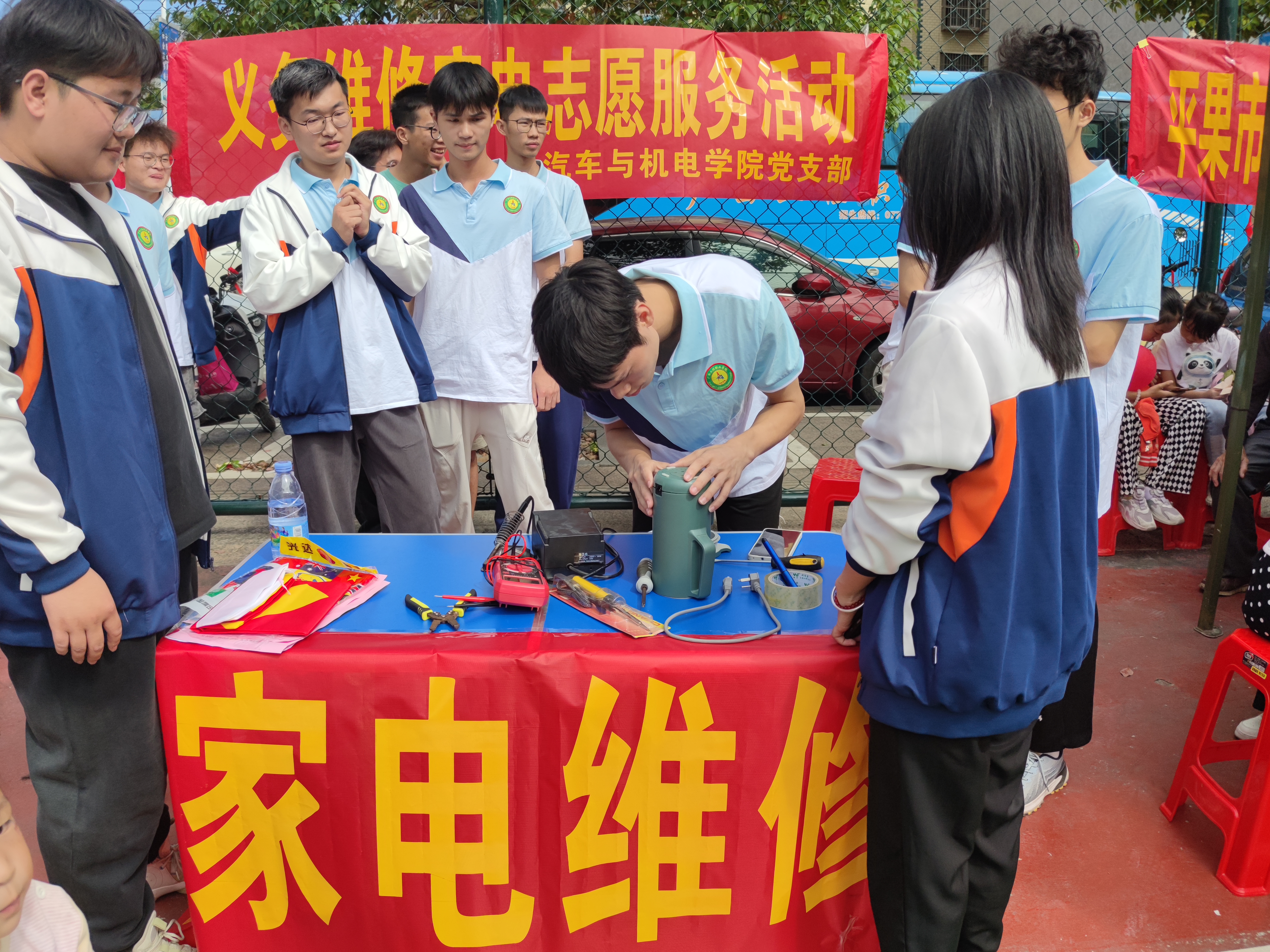 為更好的學(xué)習(xí)貫徹黨的二十大精神,弘揚志愿服務(wù)精神,構(gòu)建和諧社會,提高同學(xué)們的積極性,發(fā)揮同學(xué)們的才干與能力,進(jìn)一步提升同學(xué)們獨立思考、勇于實踐的精神風(fēng)貌,2023年10月21日,汽車與機電學(xué)院黨支部在學(xué)校黨委組織下到平果市大學(xué)園區(qū)馬頭鎮(zhèn)新興社區(qū)籃球場開展了“我為群眾辦實事”義務(wù)家電維修活動。