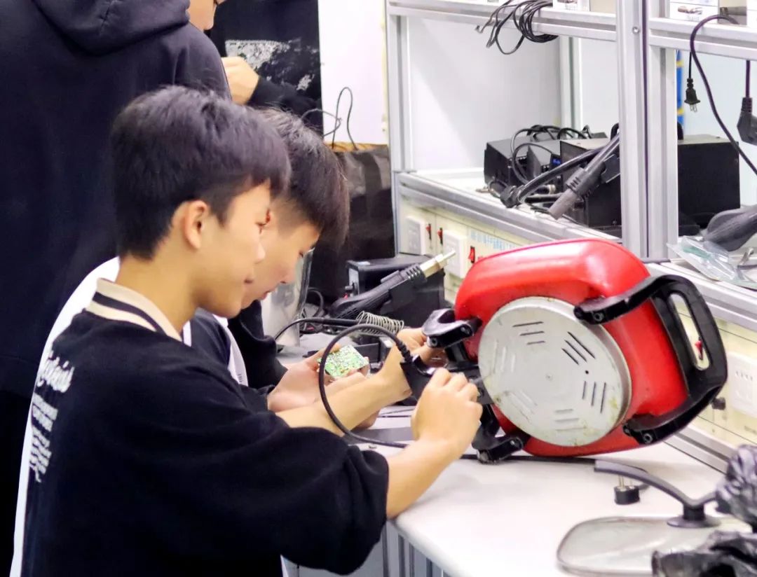 在維修實(shí)訓(xùn)室,學(xué)生志愿者們在張軍華老師的指導(dǎo)下,憑著過硬的專業(yè)知識維修家電,以專業(yè)知識為師生辦好事、辦實(shí)事、解決生活實(shí)際困難和問題。汽車與機(jī)電學(xué)院黨支部副書記鄧鎮(zhèn)連也到現(xiàn)場指導(dǎo)維修活動。