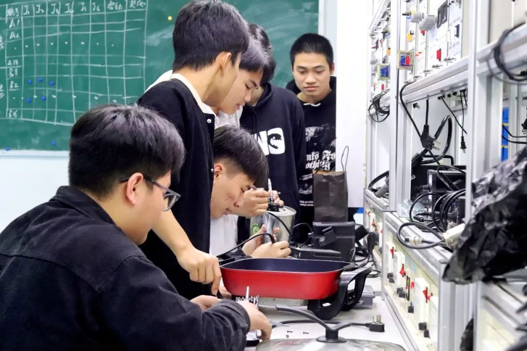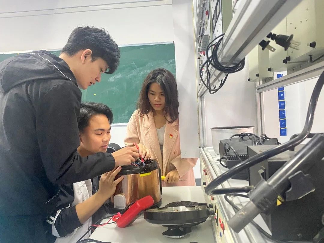 汽車與機(jī)電學(xué)院黨支部副書記鄧鎮(zhèn)連和指導(dǎo)老師張軍華老師指導(dǎo)學(xué)生維修家電
