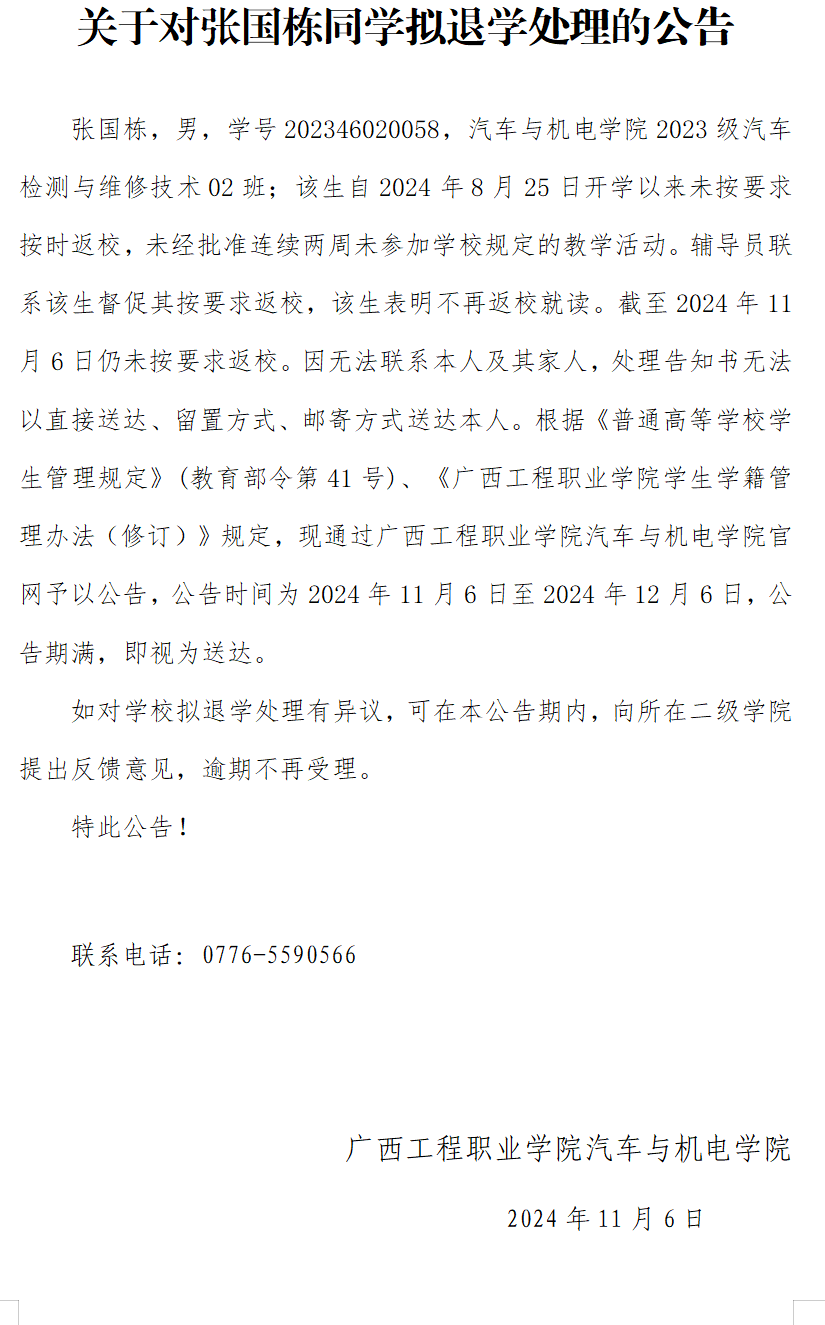 張國(guó)棟,男,學(xué)號(hào)202346020058,汽車與機(jī)電學(xué)院2023級(jí)汽車檢測(cè)與維修技術(shù)02班;該生自2024年8月25日開(kāi)學(xué)以來(lái)未按要求按時(shí)返校,未經(jīng)批準(zhǔn)連續(xù)兩周未參加學(xué)校規(guī)定的教學(xué)活動(dòng)。輔導(dǎo)員聯(lián)系該生督促其按要求返校,該生表明不再返校就讀。截至2024年11月6日仍未按要求返校。因無(wú)法聯(lián)系本人及其家人,處理告知書(shū)無(wú)法以直接送達(dá)、留置方式、郵寄方式送達(dá)本人。根據(jù)《普通高等學(xué)校學(xué)生管理規(guī)定》(教育部令第41號(hào))、《廣西工程職業(yè)學(xué)院學(xué)生學(xué)籍管理辦法(修訂)》規(guī)定,現(xiàn)通過(guò)廣西工程職業(yè)學(xué)院汽車與機(jī)電學(xué)院官網(wǎng)予以公告,公告時(shí)間為2024年11月6日至2024年12月6日,公告期滿,即視為送達(dá)。