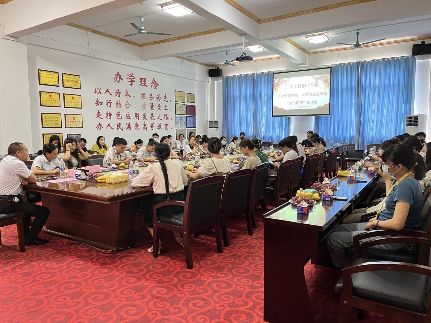 為慶祝2022年教師節(jié)、中秋節(jié),進(jìn)一步營造濃厚的節(jié)日氛圍,團(tuán)結(jié)凝聚我校教師以習(xí)近平新時(shí)代中國特色社會(huì)主義思想鑄魂育人,9月9日,鐵道與航空學(xué)院和經(jīng)濟(jì)管理學(xué)院聯(lián)合舉行”中秋節(jié)、教師節(jié),雙節(jié)同慶“座談會(huì)。學(xué)校紀(jì)委書記、副校長彭高彬,鐵道與航空學(xué)院院長覃鳳姣,經(jīng)濟(jì)管理學(xué)院院長龐英連,以及兩個(gè)學(xué)院全體教師一同參加此次座談會(huì)。