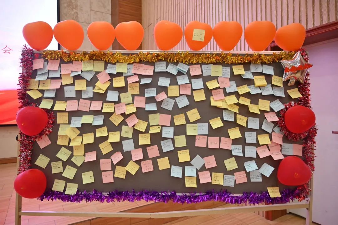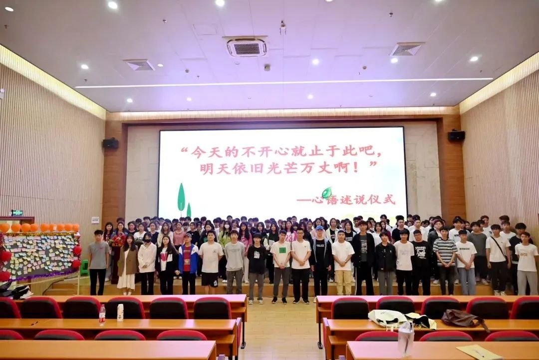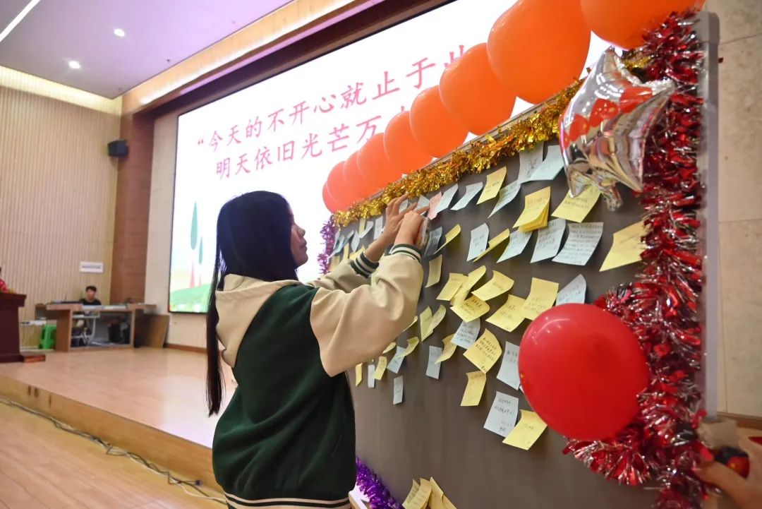 觀影結束后進行了“今天的不開心就止于此吧,明天依舊光芒萬丈啊”心語述說儀式,工作人員給每個同學都發(fā)放一張便利貼,同學們在便利貼寫上近期不開心或者苦惱的事情,依次上臺貼在了展板上,以此告別煩惱。