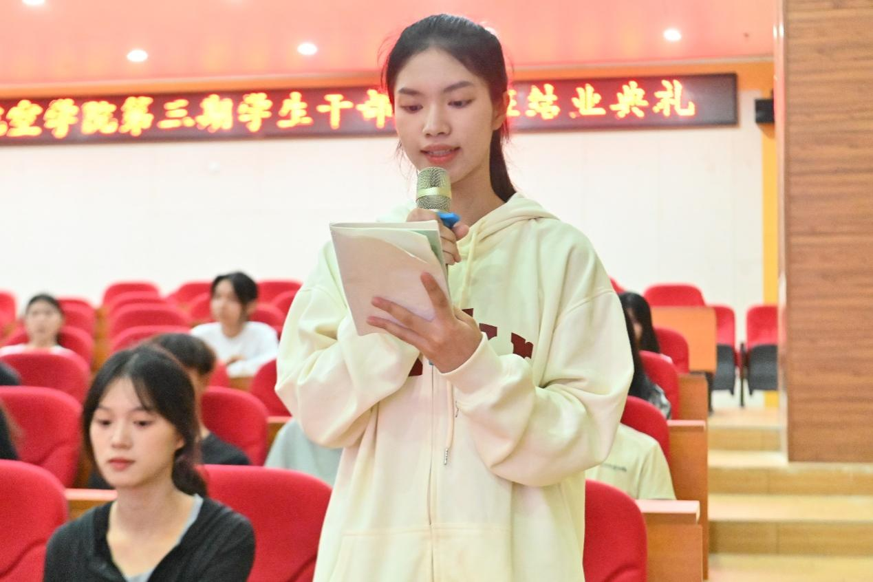 黨支部書(shū)記、副院長(zhǎng)廖嬌為學(xué)生干部頒發(fā)結(jié)業(yè)證書(shū)