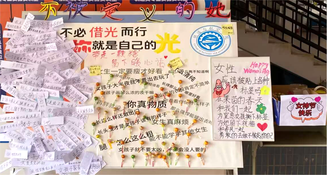 活動(dòng)伊始,學(xué)生會(huì)成員先在展板上粘貼了女性的標(biāo)簽,通過(guò)展板展示,讓學(xué)院女生撕下標(biāo)簽,打破外界對(duì)女生的偏見(jiàn)、束縛和刻板印象,并且重新貼上給予自己及她人的祝福語(yǔ)。激勵(lì)大家解開(kāi)束縛,自信地做自己?;顒?dòng)過(guò)程中,吸引了學(xué)院眾多老師和同學(xué)們的關(guān)注,她們都表示此次活動(dòng)新穎,極具意義。