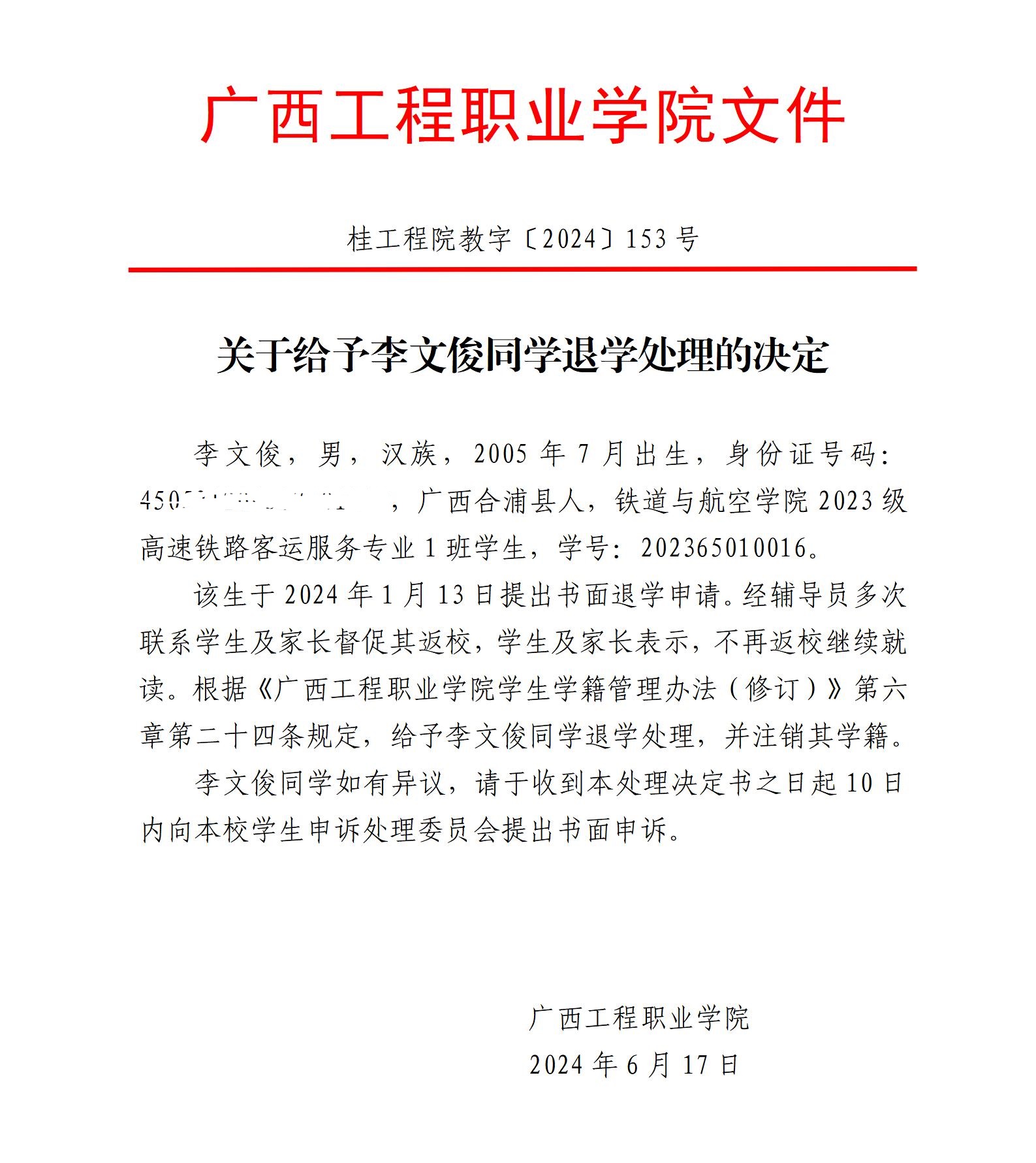 根據(jù)《普通高等學(xué)校學(xué)生管理規(guī)定》(教育部令第41號)、《廣西工程職業(yè)學(xué)院學(xué)生學(xué)籍管理辦法(修訂)》第二十四條規(guī)定,給予李文俊同學(xué)退學(xué)處理,并注銷其學(xué)籍。