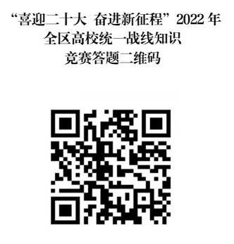 為深入學(xué)習(xí)宣傳習(xí)近平總書記關(guān)于做好新時代黨的統(tǒng)一戰(zhàn)線工作的重要思想,學(xué)習(xí)宣傳貫徹中央、自治區(qū)黨委統(tǒng)戰(zhàn)工作會議精神,深化黨史學(xué)習(xí)教育和深入學(xué)習(xí)宣傳《中國共產(chǎn)黨統(tǒng)一戰(zhàn)線工作條例》,積極推動統(tǒng)戰(zhàn)知識進校園,引導(dǎo)廣大師生以賽促學(xué)、以賽促宣,在濃厚的學(xué)習(xí)氛圍中凝聚團結(jié)奮斗共識,喜迎黨的二十大順利召開,自治區(qū)黨委教育工委舉辦“喜迎二十大·奮進新征程”2022年全區(qū)高校統(tǒng)一戰(zhàn)線知識競賽活動。請全校師生積極掃碼參賽。