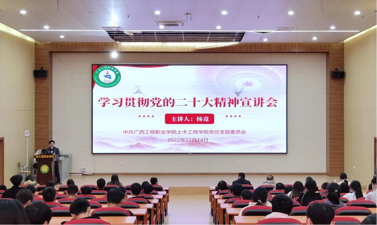 2022年12月14日,土木工程學(xué)院黨總支在圖文信息大樓三樓學(xué)術(shù)報(bào)告廳,召開學(xué)習(xí)宣傳貫徹黨的二十大精神宣講會(huì)。土木工程學(xué)院黨總支書記楊竟同志向土木工程學(xué)院教師黨員、學(xué)生黨員、入黨積極分子、學(xué)生干部作黨的二十大精神宣講。